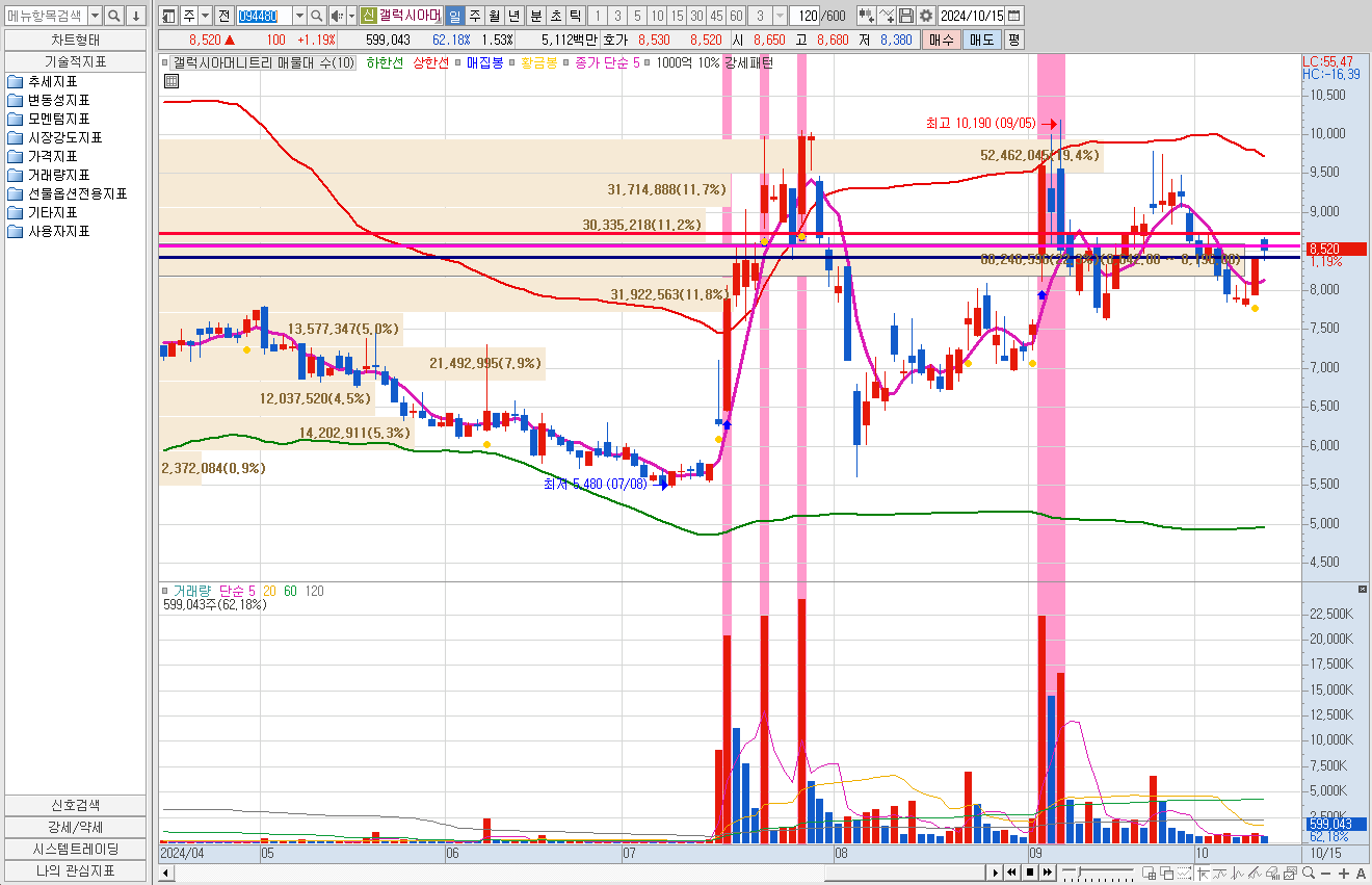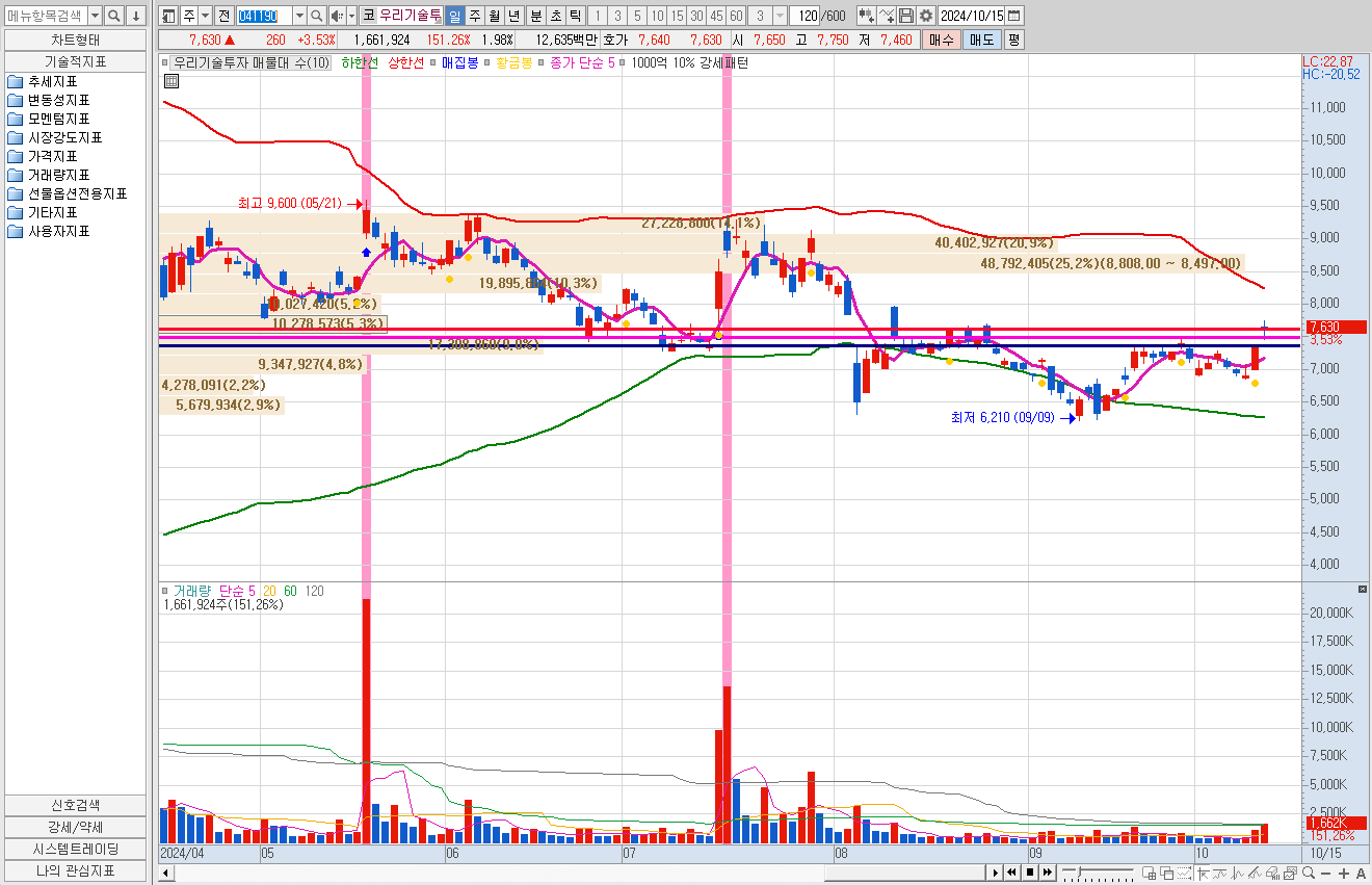 갤럭시아에스엠, 머니트리는 비슷한 모습을 하고 있으며, 우리기술투자 같은 경우 아직 추세를 돌리지 못해보인다. 하지만 두번의 수급이 들어온 것을 볼 수 있기 때문에 기사거리만 있으면 충분히 8,500원까지는 갈 것으로 예상이 된다.