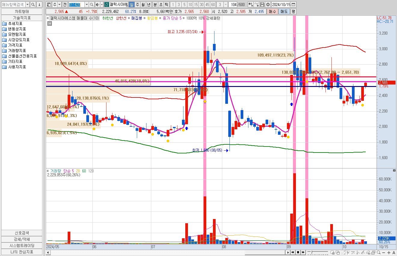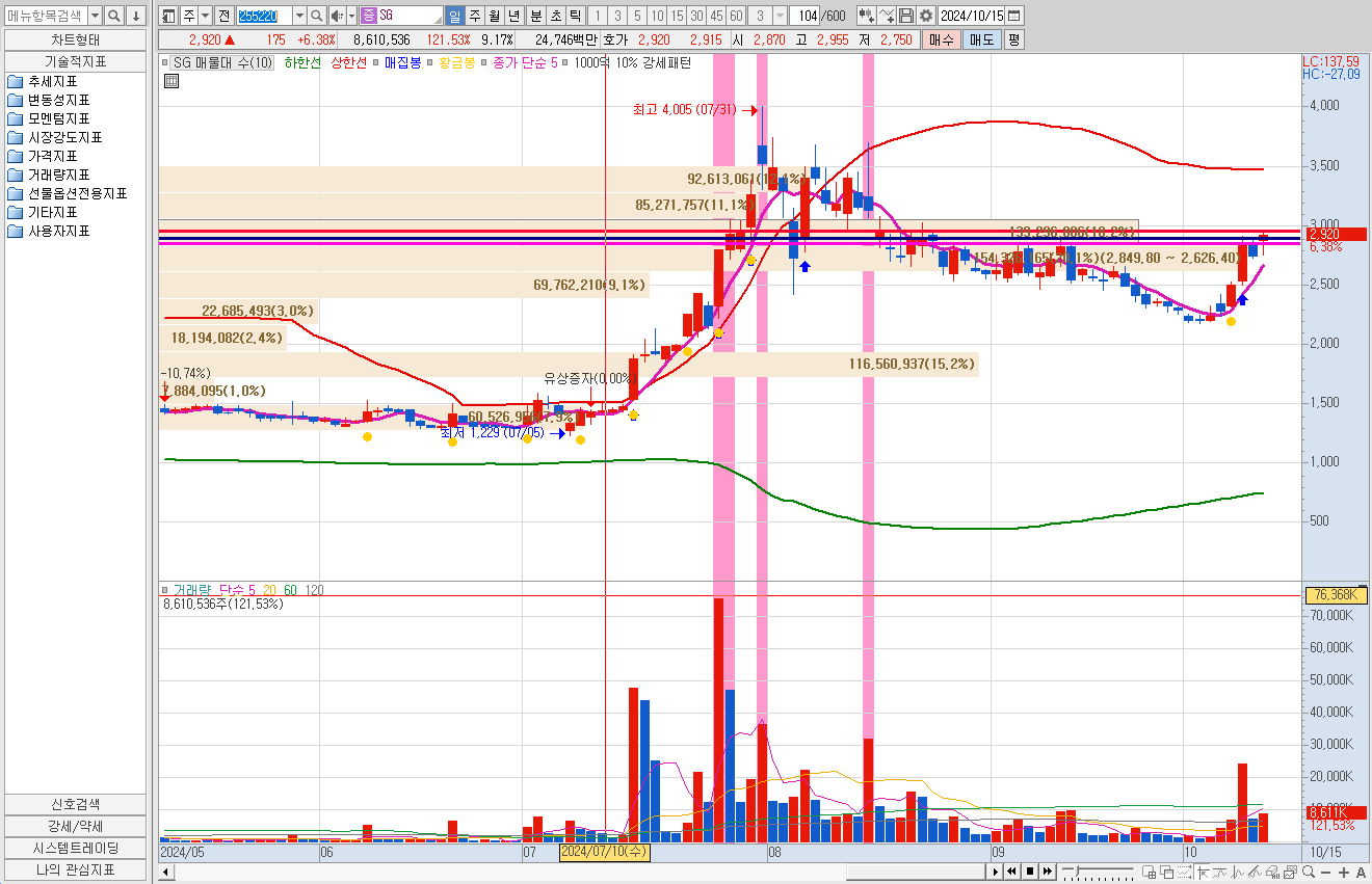 SG 차트, 우상향 종목으로서 수급도 들어와 있는 상태이며, 대물대가 그렇게 두텁지 않기 때문에 쉽게 3,500원까지는 갈 수 있을 거라 생각이 든다. 충분히 노려볼만한 종목이라 생각이 든다.