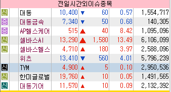 시간외 대동 그룹주 상승 #대동 (+10.00%) #대동금속 (+9.95%) #대동기어 (+3.72%) 내년 안정적인 실적 개선 및 트럼프 수혜주 분석 등에 시간외 일부 조선기자재 테마 상승 #인화정공 (+5.67%) #일승 (+2.17%) [News] 일론 머스크 테슬라 CEO, 자사 챗봇 통한 AI진료 언급 소식 속 시간외 일부 의료AI 테마 상승 #셀바스AI (+5.12%) #셀바스헬스케어 (+2.87%) #딥노이드 (+1.94%) #파로스아이바이오 (+1.88%) [News] 노스볼트 파산 보호 신청 속 국내 업체 반사이익 기대감 부각 등에 시간외 일부 2차전지 테마 상승 #아이비젼웍스 (+2.74%) #이엔플러스 (+2.53%) #금양 (+2.29%) #큐라티스 (+9.89%) 장 마감 후 운영자금 확보 목적으로 (주)피스투에스코리아(최대주주) 대상 10,300,000주(64.99억원) 규모 제3자배정 유상증자 결정 및 운영자금 확보 목적으로 (주)피스투에스코리아(최대주주) 대상 5,600,000주(35.33억원) 규모 제3자배정 유상증자 결정 공시 #케이씨에스 (+4.62%) AWS, 양자 컴퓨팅 도입 가속화 목적 퀀텀 엠바크 출시 소식에 따른 미국 양자컴퓨팅 업체 주가 급등 영향 #위츠 (+4.33%) 11월20일 코스닥시장 신규 상장 #TYM (+4.29%) 시간 외 일부 농업 테마 상승