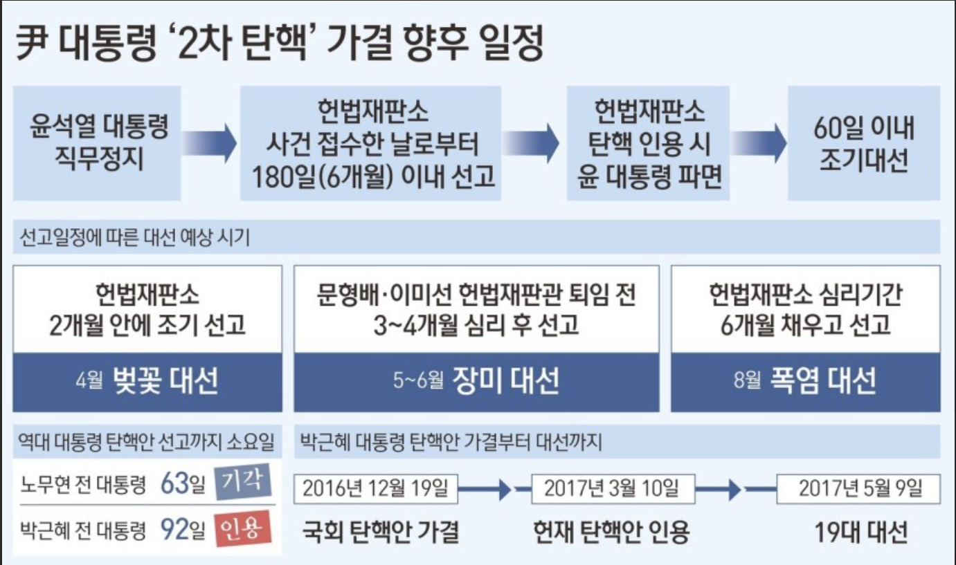 후임 대통령 선거 결과에 따른 정국 변화 새로운 대통령이 누구인지에 따라 정국이 안정되거나 더 혼란스러워질 수 있다. 야당 출신 대통령 당선 - 정책 변화가 급격히 진행될 가능성이 높다. - 이전 대통령의 정책 폐기 및 재조정. 여당 출신 대통령 당선 - 정국 안정화를 도모하나 야당의 강한 견제 예상 총리 중심 국정 운영 체제 장기화 선거 준비 기간 동안 국무총리가 실질적인 행정부 수반 역할을 맡게 된다. 권한대행 체제 장기화 시 정국 공백 우려.
