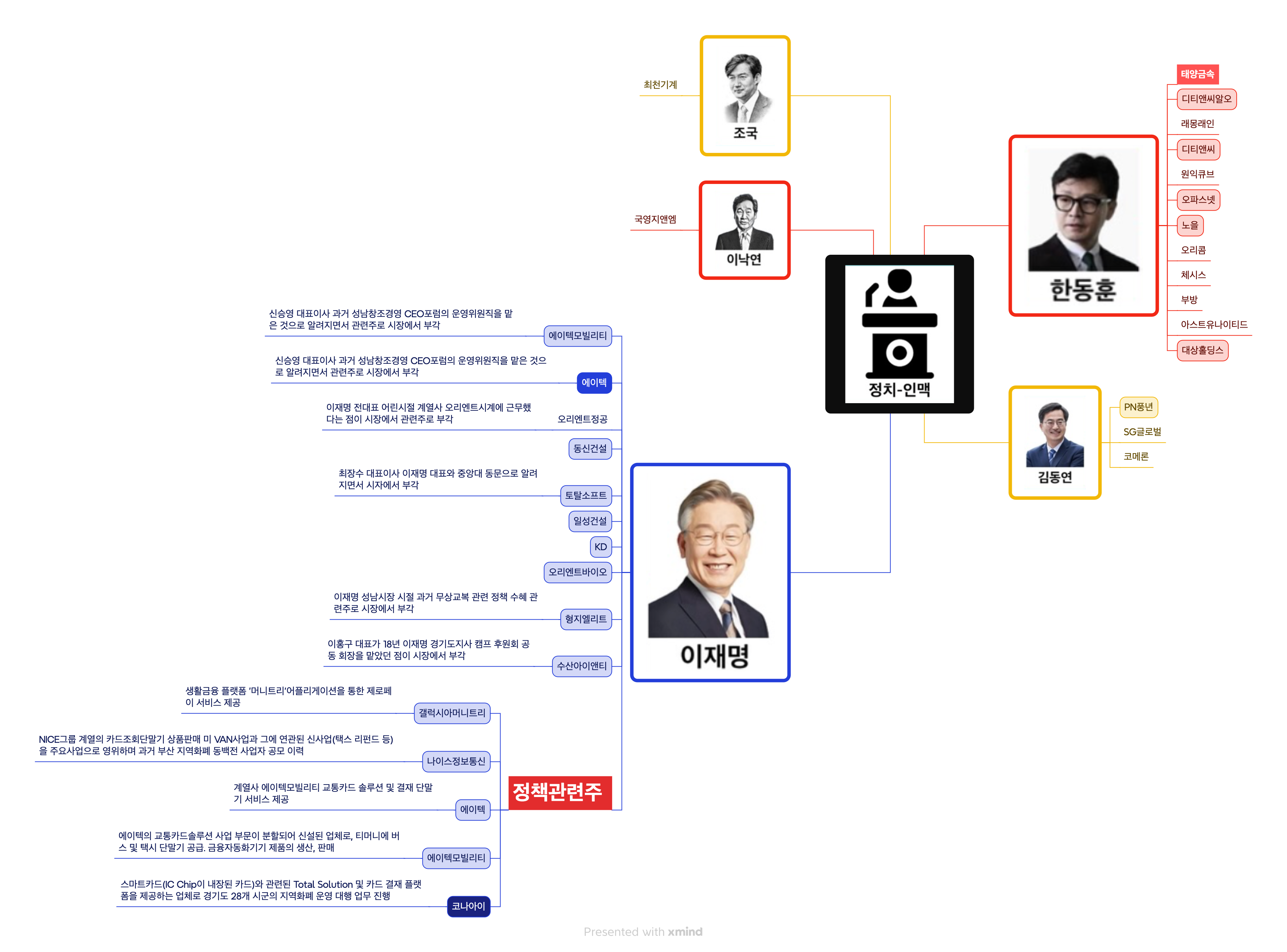 다음으로 여당에서는 한동훈 당대표가 대표주자다. 대장격으로는 태양금속, 대상홀딩스, 노을, 오파스넷 등이 있다.