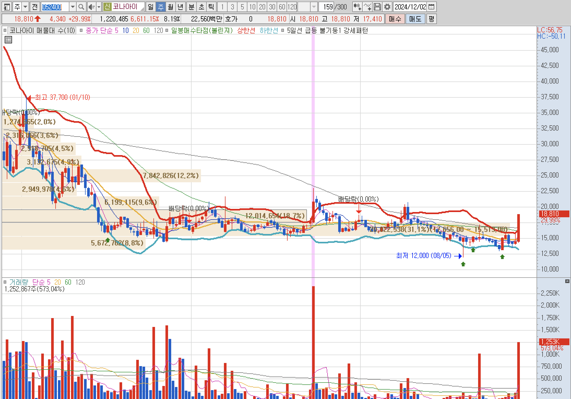 상단이 열려있고 매물을 해도 25,000원부근에 있지만 지금으로서는 별문제 없이 계속 오를 수 있는 종목으로 보인다. 수급도 들어온 상태이기 때문에 관심을 갖아봐도 좋을 듯하다.