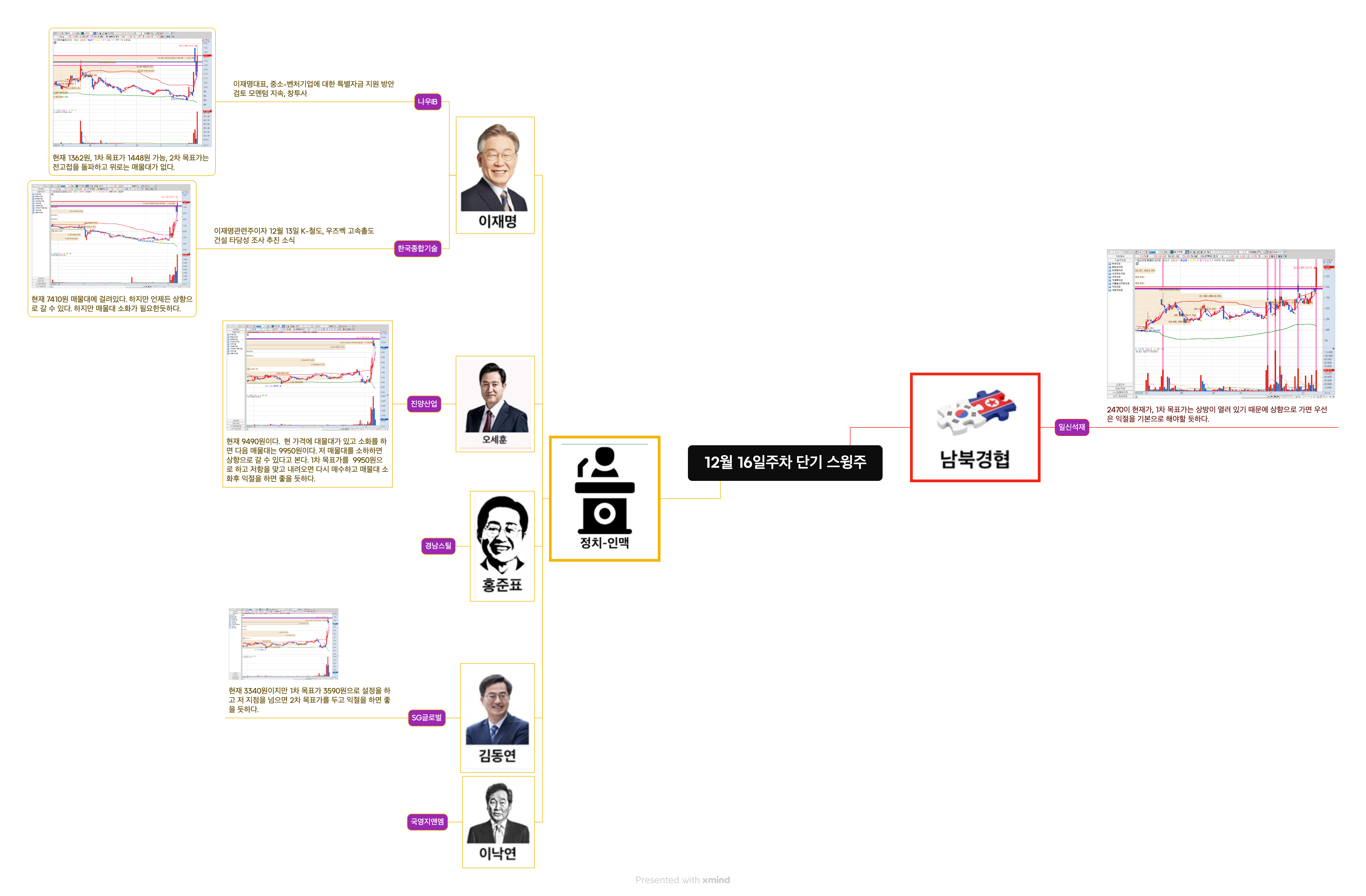 대부분이 정치테마주가 주를 이룬다. 금일 작성일 기준(12월 14일) 윤석열 탄핵 소추안이 가결이 되었다. 그러면서 대통령 모든 직무를 정지하게 된다. 결정은 헌법재판소로 넘어갔다. 그러면서 이재명대표 관련주가 월요일엔 크게 올라갈 수 있다. 단기스윙주에 나온 종목은 나우 IB와 한국종합기술 종목이지만, 동신건설, 에이텍, 에이텍모빌리티, 코나아이 같은 경우도 같이 움직일 수 있다. 여당 차기 대권주자를 찾아야하는데 현재로서는 쉽지가 않다. 누가 나오든 야당 이재명대표를 대적할 사람이 없다. 그렇다면 오세훈서울시장이 좀 그나마 인기가 있다. 오세운 관련주인 진양산업도 그러니 같이 봐야햐하지 않을까 싶다. 트럼프 차기 대통령이 김정은과 친하다는 말한마디로 일신석재 남북경협주가 상한가를 갔다. 수급이 들어왔기 떄문에 쉽게 무너지지 않을 것이다. 그러므로 차분히 모아가는 것도 방법일 수 있다. 아니면 월요일에 윗꼬리를 달 수 있으니 조심해야한다. 수급이 월요일 아침엔 이재명관련주로 움직일 확률이 높아졌다. 에이텍이 대장이니 잘 관심을 갖고 봐야한다 이재며 관련주가 모두 투자경고가 붙어있기 때문에 다른 종목들, 오리엔탈정공, 동신건설, 코나아이 모두 잘보고 대응하도록 하자.