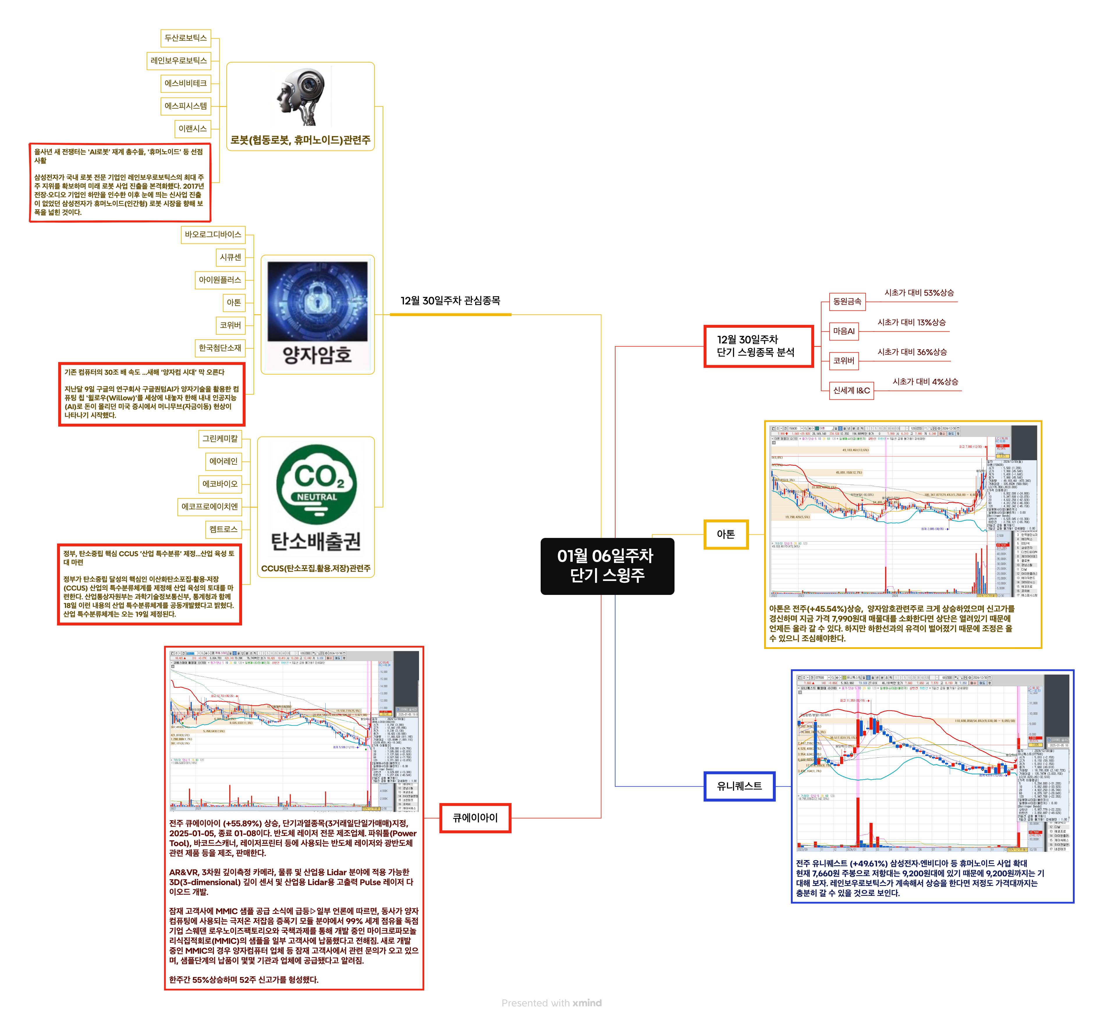 먼저 지난주에는 로봇주, 양자암호, 탄소 CCUS관련주가 크게 상승을 보여줬다. 1월 06일주차 단기스윙검색식에 나온 종목이 무엇이 있는지 하나하나 보도록 하자. 먼저 아톤이라는 종목부터 보도록 하자. 아톤이라는 종목은 양자암호 관련주로서 11월 19일, 12월 04일, 12월 13일 1000억 10%강세패턴이 나오고 25년 1월 03일 금요일에 상한가를 갔다. 수급은 계속해서 들어오고 있다가 상한가를 간것이기 때문에 향후에도 기대가 되는 종목이다. 이유는 양자암호 종목이 계속해서 이슈가 되고 뉴욕 양자암호 관련주들이 크게 상승을 하고 있기 때문에 우리나라도 기대가 된다. 하지만 조심해야하는 것이 뉴욕 리케티컴퓨팅이나 양자암호 관련주가 단기간에 500%이상 상승을 했기 때문에 언제든 조정을 받을 수 있고 그러면 우리나라도 같이 양자암호가 조정을 받을 수 있으니 뉴욕증시 리케티컴퓨터를 예의주시해서 봐야한다. 다음 두번째 종목은 유니퀘스트 종목이다. 전주에 49.61%나 상승을 했으며, 12월 30일(월)에 상한가를 갔으며 상단에서 빠지지 않고 있는 모습이다. 삼성전자, 엔비디아 등 휴머노이드 사업 확대한다는 소식이 나오면서 로봇 관련주가 크게 부각을 받고 있다. 지금까지 조정을 받았다면 이제 슬슬 봐도 좋을 듯하다. 24년 1월에 마찬가지로 수급이 들어왔다가 1년만에 다시 수급이 들어왔다. 로봇 관련주가 1월달에 기대가 된다. 물론 대장격인 레인보우로보틱스의 움직임을 봐야하고 두산로보틱스도 같이 보면 좋다. 현재 7,660원으로 주봉으로는 9,200원대가 저항 구간이기 때문에 저기까지는 우선 대기하고 보도록 하자. 마지막으로 큐에이아이라는 종목으로 전주에 55.89%상승했다. 어떻게 보면 로봇이나 양자암호보다 더 많이 오른 종목이다. 그러다보니 단기과열종목으로 지정이 되고 08일에 종료가 된다. 이 종목은 잠재 고객사에 MMIC샘플 공급 소식에 급등을 하였다. 일부 언론에 따르면 동사가 양자컴퓨터에 사용되는 극저온 저잡음 증폭기 모듈 분야에서 99%세계 점유율 독점기업 스웨덴 로우노이즈팩토리와 국책과제를 통해 개발 중인 마이크로 파모놀리식직접회로(MMIC)의 샘플을 일부 고객사에 납품했다고 전했다. 새로 개발한 MMIC의 경우 양자컴퓨터 업체 등 잠재 고객사에서 관련 문의가 오고 있으며, 샘플단계의 납품이 몇몇 기관과 업체에 공급됐다고 알려지면서 신고가를 기록했다. 8일 장막판까지 크게 빠지지 않으면 8일 2시30분이후에 매매를 해볼 예정이다. 물론 3종목 모두 월요일 시초가로 매매를 해서 수익을 내면 좋겠지만, 나는 금요일에 유니퀘스트를 매매했다. 아톤은 상한가를 갔기 때문에 월요일도 상승을 할 것으로 보인다. 그렇다면 조정을 줄 때 조금이라도 빠지게 된다면 그 때 매매를 하든 아니면 월요일에 그냥 올라가 버리면 나의 종목이 아니라 생각을 한다. 하지만 양자암호는 계속해서 관심을 갖아 봐야하고 관련주도 지속적으로 봐야한다. 물론 리케티컴퓨팅을 보면서 같이 매매를 해도 좋을 듯하다.