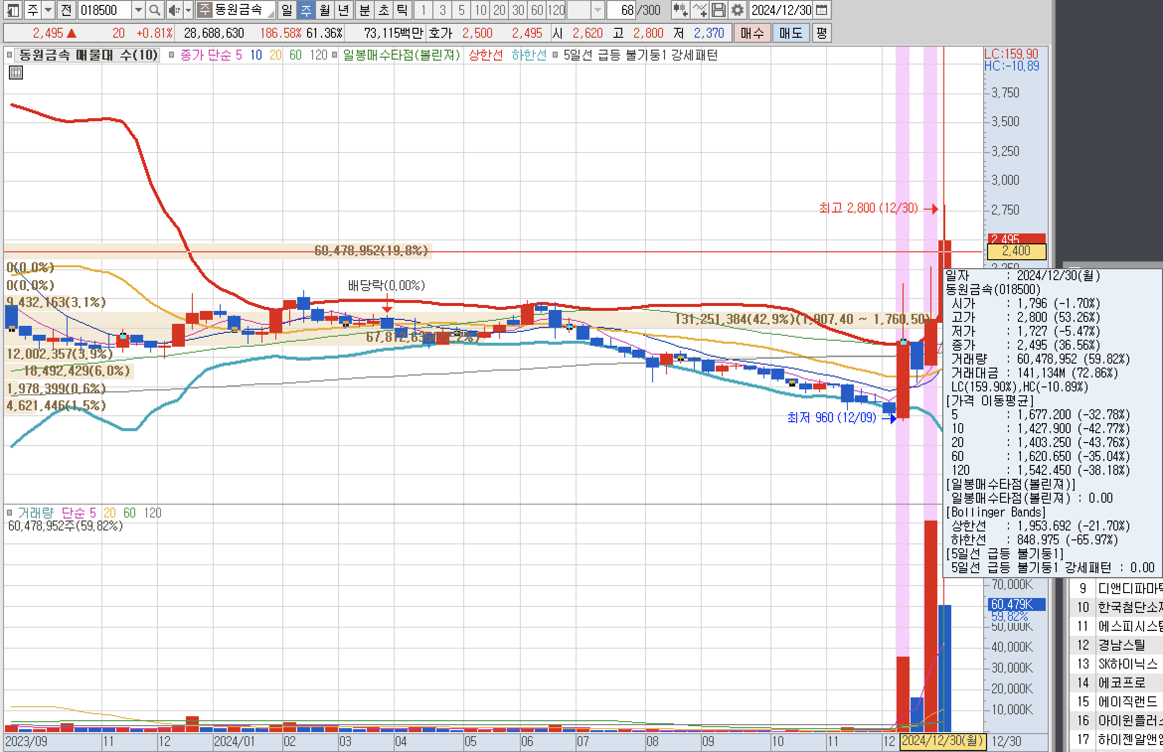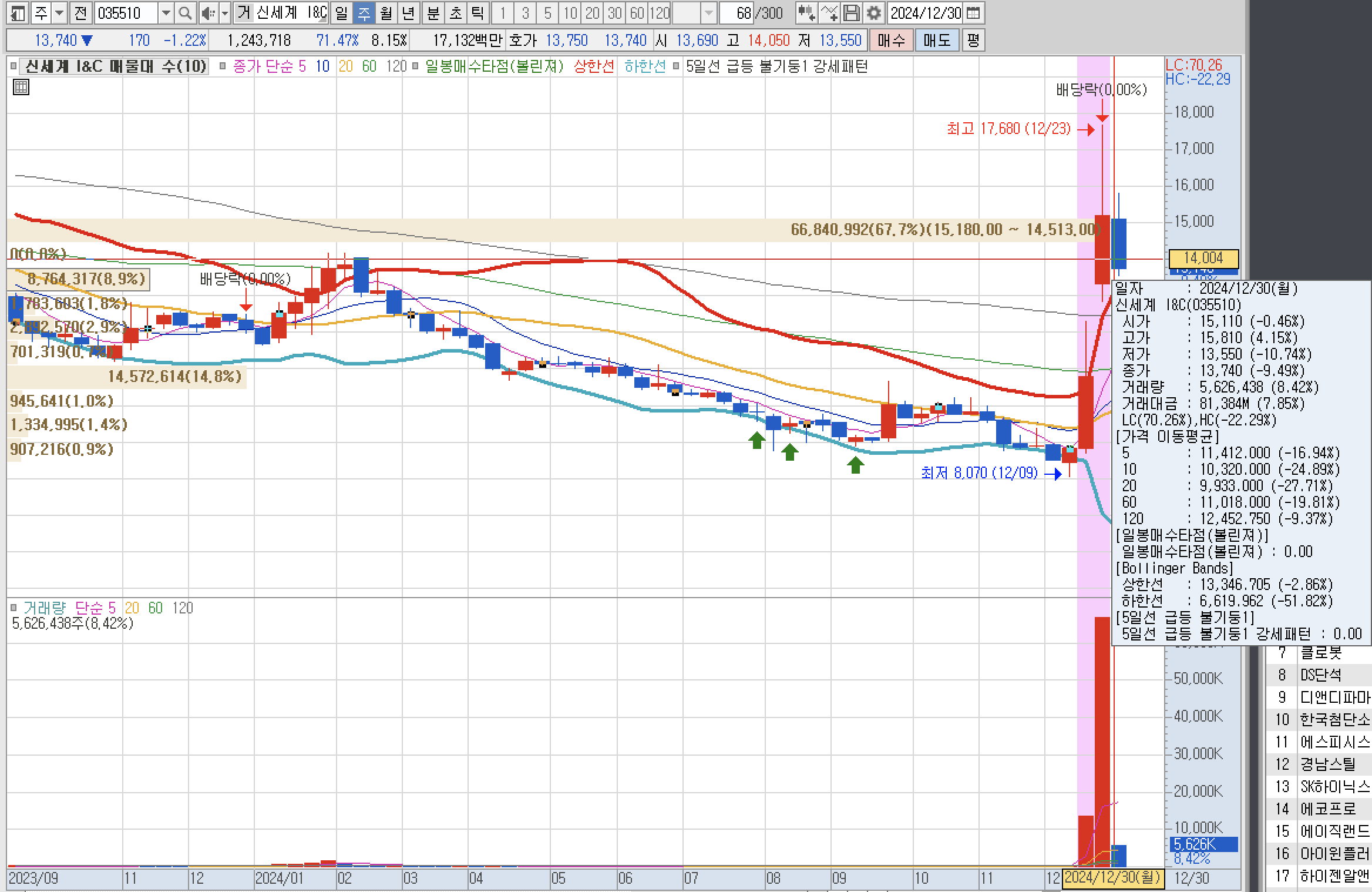 첫번째 동원금속이라는 종목이다. 이 종목은 정치테마주이다. 시초가 1,796원으로 시작으로 한 주간 고가 대비 53.26%상승하였다. 크게 상승한 종목이다. 이재명관련주가 크게 상승하였다. 새해 차기 대권주가 여론조사에서 이재명대표가 36%정도 나오면서 관련주가 크게 상승하였다. 두번째 종목은 신세계 I&C다.