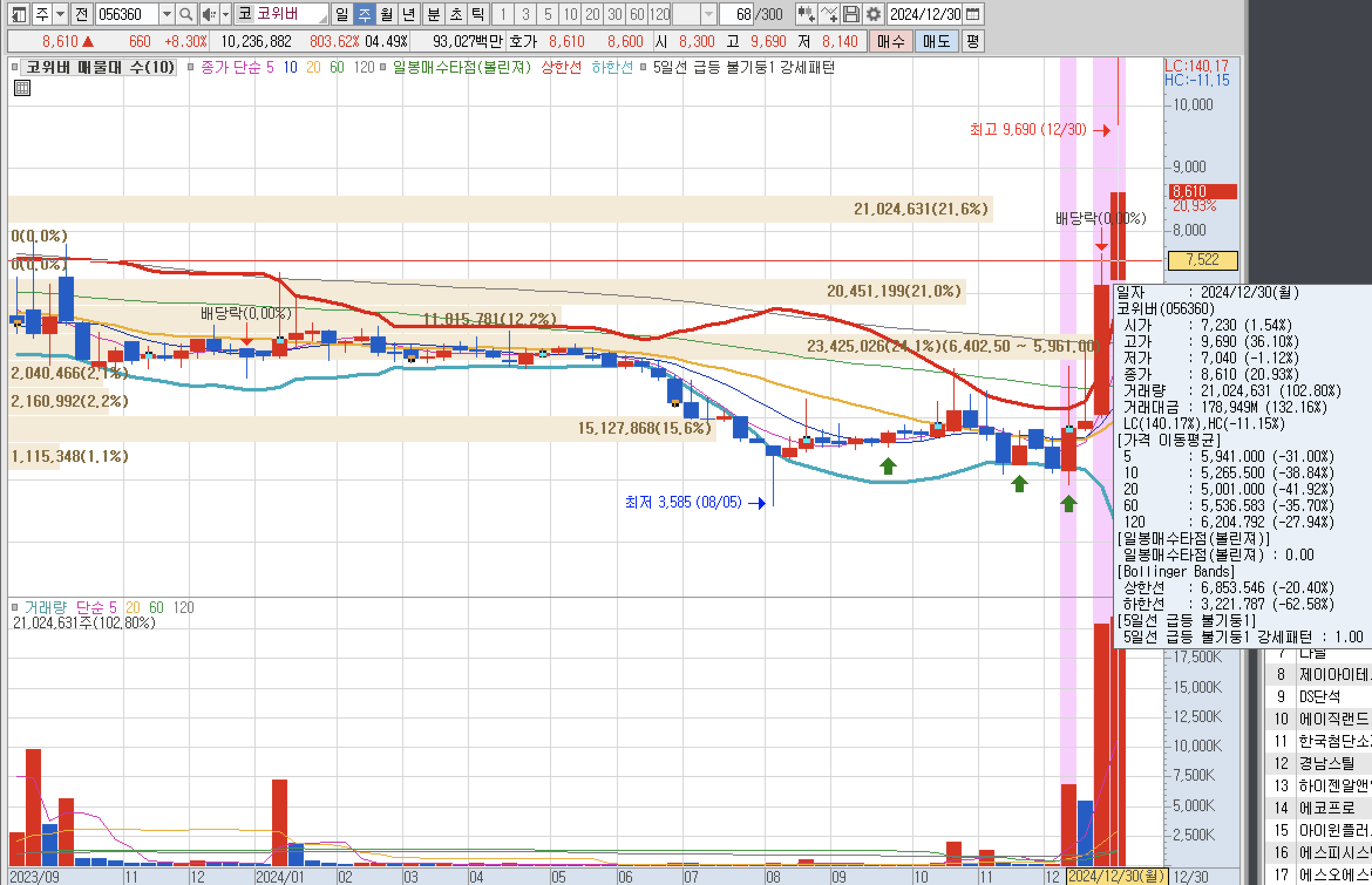 그 전주에 정용진 신세계그룹 회장이 트럼프를 만나고 오면서 크게 상승을 했다. 그러면서 신세계그룹과 중국 알리바바그룹이 국내 이커머스시장을 공략하기 위해 손을 맞잡기로 했다는 내용으로 크게 상승을 했다. 하지만 이번엔 시가 15,110원을 시작으로 고가 15,810원인 4%상승하며 마무리 했다. 세번째 종목은 코위버다.