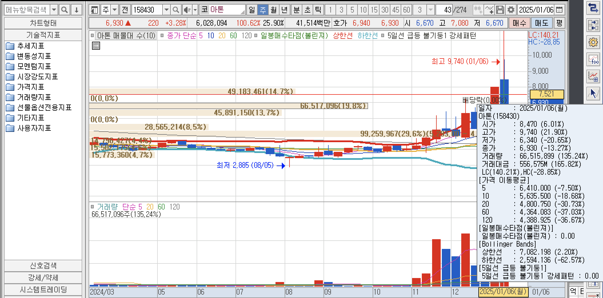 시가 7,660원으로 시작해서 고가 8,770원 14%정도 상승하였는데 10%정도 수익을 보고 매도하였다. 지난주에 작성한 것은 9,200원대 매물이 몰려 있기 때문에 그정도 수준까지는 오를거라 생각했는데 그러지 못하고 빠지는 것 같아 시세를 주기에 매도를 했다. 01월 03일 종가로 매수해서 01월 09일에 매도를 했다. 하지만 로봇관련주가 계속해서 이슈가 되고 있기 때문에 9,200원만 소화한다면 더 올라갈 수 있다고는 보고 있다. 상단은 열려있는 상황이기 때문에 충분히 올라갈 수 있다고 본다. 마지막으로 아톤이다. 양자암호 관련주로서 초반에 크게 상승을 하다가 CES2025에서 젠슨황의 양자컴퓨터는 너무나 오랜 시간이 걸린다는 말에 크게 하락을 하였다.