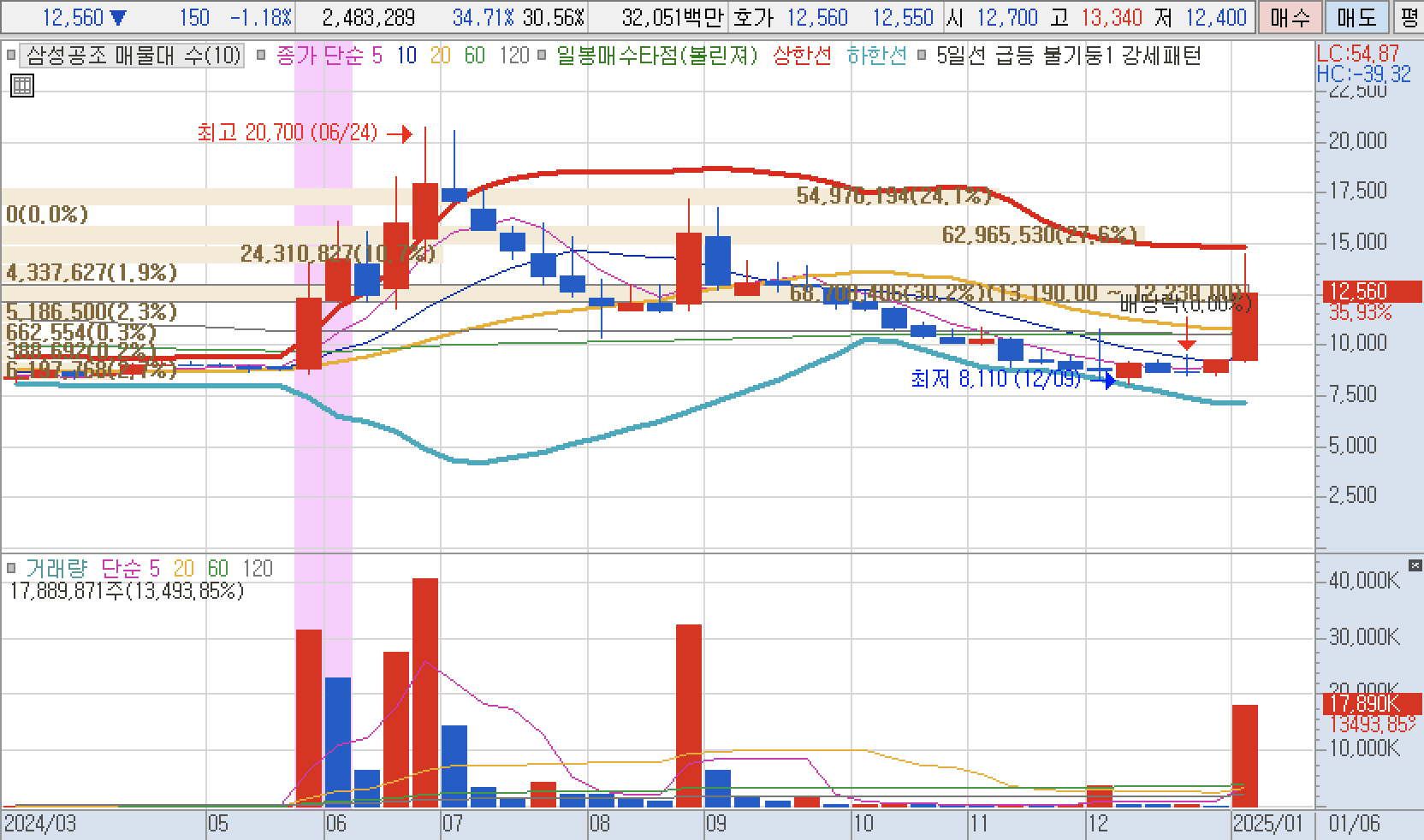 첫번째 종목은 삼성공조다. 이 종목은 시세를 한번 줄 때 너무나 잘 준다. 등락률이 크다는 것은 좋은 점도 있지만 단점도 충분히 있다. 차트를 보면서 이야기하자.