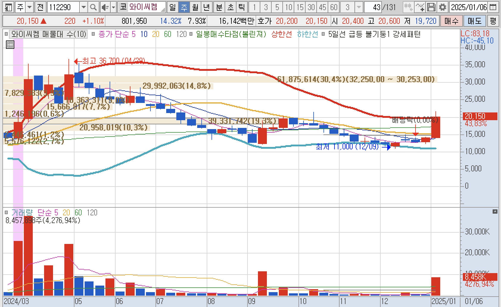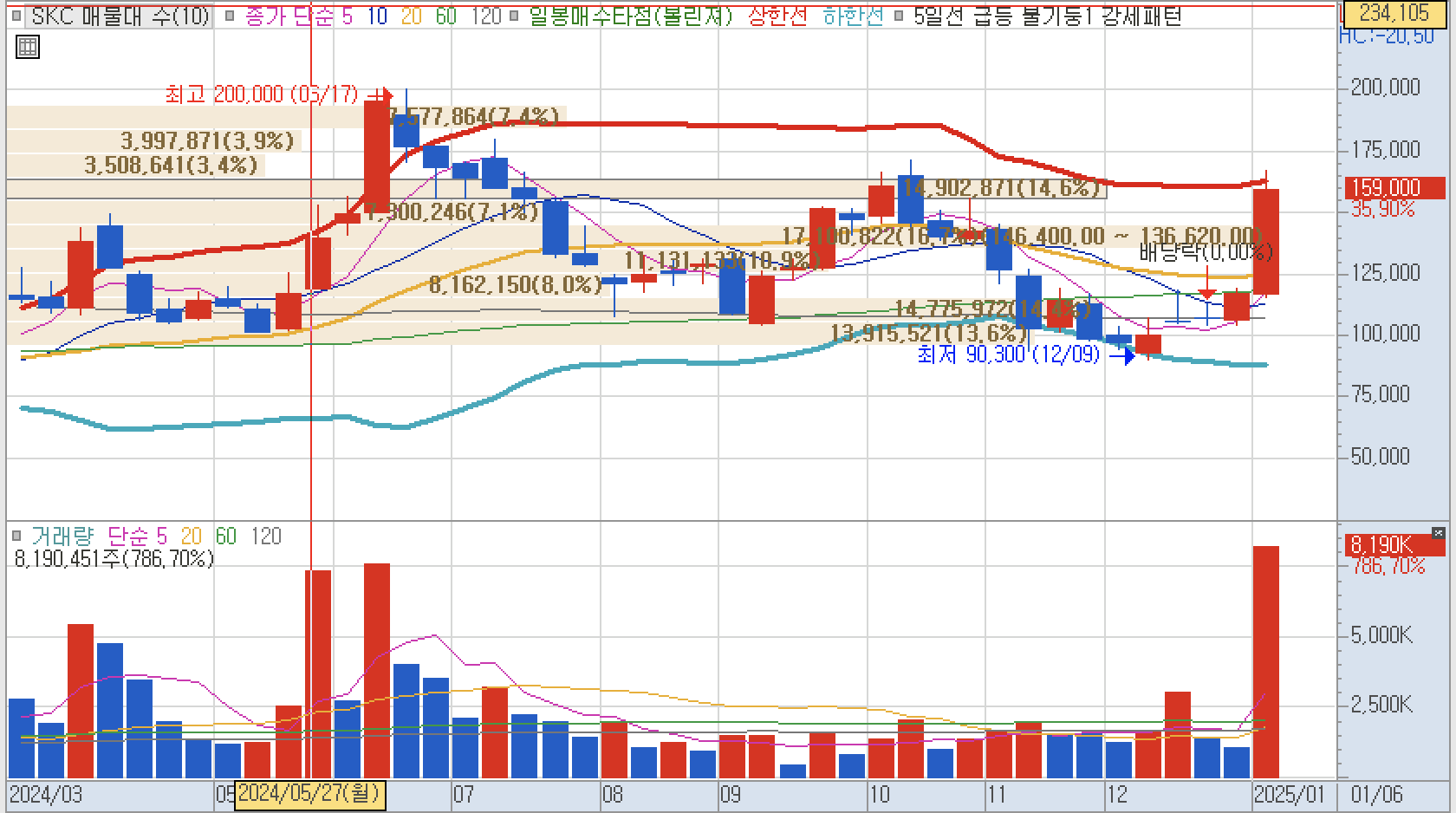 이 차트는 주봉차트이다. 현 위치가 매물대가 있는 위치다. 저 자리를 소화하면 다음 자리는 15,400원대인데 차주엔 충분히 갈 수 있을 거라 생각한다. 08일에 상한가를 갔고 상단에서 크게 빠지지 않고 위치하고 있다면 다음엔 충분히 올라 갈 수 있다. 그래서 이 종목을 매수한고 있는 상황이다. 이 종목은 CES 2025 액침냉각 기술 주목 속 냉각시스템(액침냉각 등) 관련주로 시장에서 부각되며 상한가를 간 것이다. 다음 종목은 SKC이다 이 종목은 최태원 SK그룹 회장이 SKC(011790) 유리 기판의 엔비디아향 공급을 시사했다. SK는 미국 라스베이거스에서 열린 세계 최대 전자·정보기술(IT) 전시회 ‘CES 2025’에서 SKC의 유리 기판 실물을 전시하며 차세대 기판에 대한 자신감을 드러냈는데 최 회장이 직접 나서 영업에 성공하면서 인공지능(AI) 반도체 밸류체인 선점에 한 발자국 가까워졌다.
