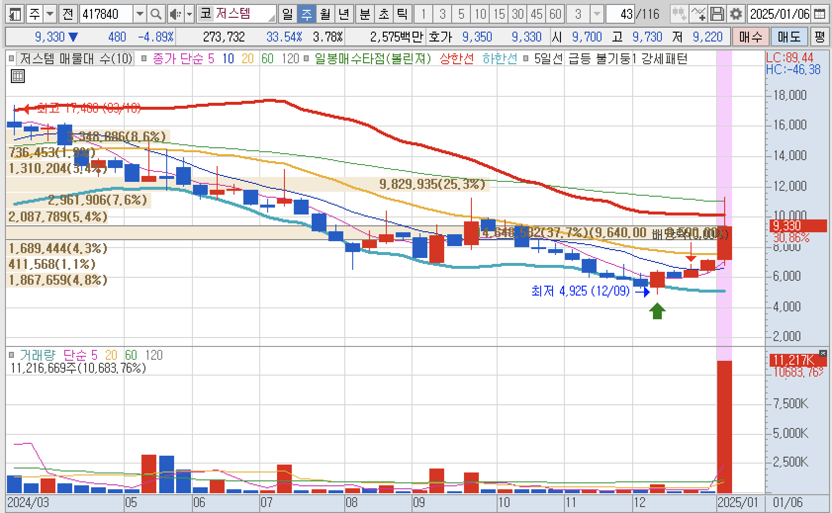월요일에 상한가를 가고 7,8,9,10일 모두 음봉 혹은 보합 정도였다. 현재 위치가 매물소화자리라 보면 될 것 같고, 차주엔 충분히 올라갈 수 있다고 본다. 저자리를 소화하면 다음 매물대가 없기 때문에 목표가 4,430원정도로 보고 매수를 하면 좋을 듯하다. 4일동안 충분히 매물대를 소화하고 있기 때문에 뉴스하나면 충분히 올라갈 수 있다고 생각한다. 다음 종믁은 저스템이라는 종목이다. 이 종목은 엔비디아, 차세대 GPU 지포스 RTX50 시리즈에 마이크론 메모리 탑재 소식 속 마이크론 글로벌 생산 거점에 N2 LPM 공급 사실 부각되며 7일에 상한가를 갔다. 그리고 8일에 22%까지 올랐다가 윗꼬리를 달고 내려왔고, 거래대금 없이 10일에 음봉으로 마무리 했다.