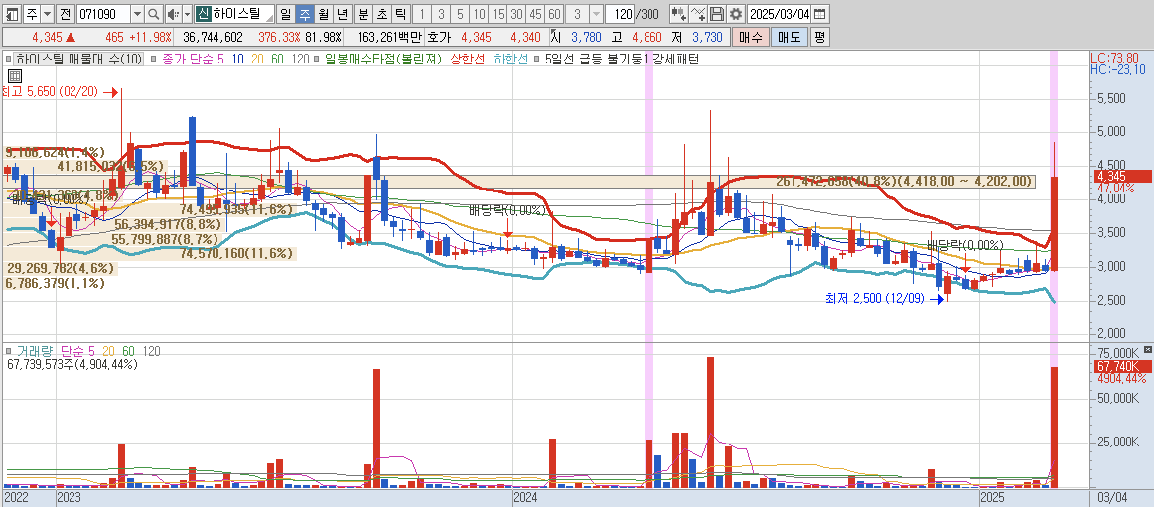 하이스틸의 경우도 차트는 거의 완변합니다. 수급은 들어왔고 차트도 볼린져밴드에서 상단을 넘어섰기 때문에 차주에 기대할만 한 것 같습니다.