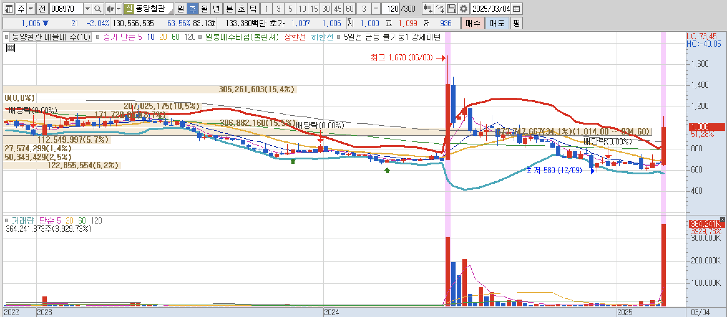 이 종목은 개인/외국인/기관 모두 싹쓰리 한 종목입니다. 3월 4일에 상한가를 갔었고 이제 발동이 걸린 것으로 보입니다. 트럼프 2기에는 조선주와 방산주가 주가 될 수 있다는 이야기가 계속 나오고 있기 때문에 언제든 상승을 할 수 있다고 봅니다.