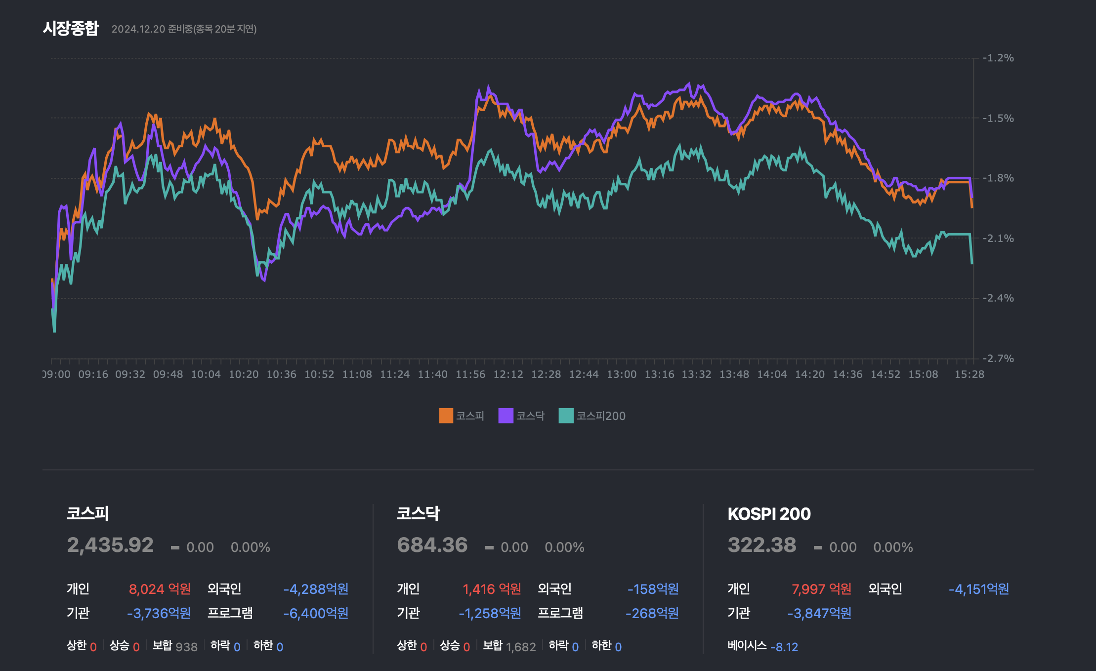 2,435.93(-48.50P, -1.95%)으로 장을 마감. 수급별로는 외국인과 기관이 각각 4,341억, 5,097억 순매도, 개인은 8,030억 순매수. 선