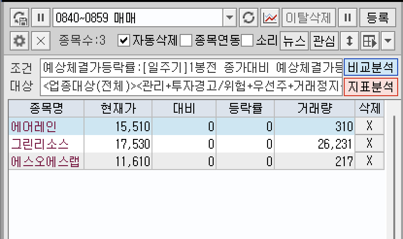 조금 이르긴 하지만 검색식에 검색된 종목은 3종목, 에어레인, 그린리소스, 에스오에스랩 이렇게 된다.