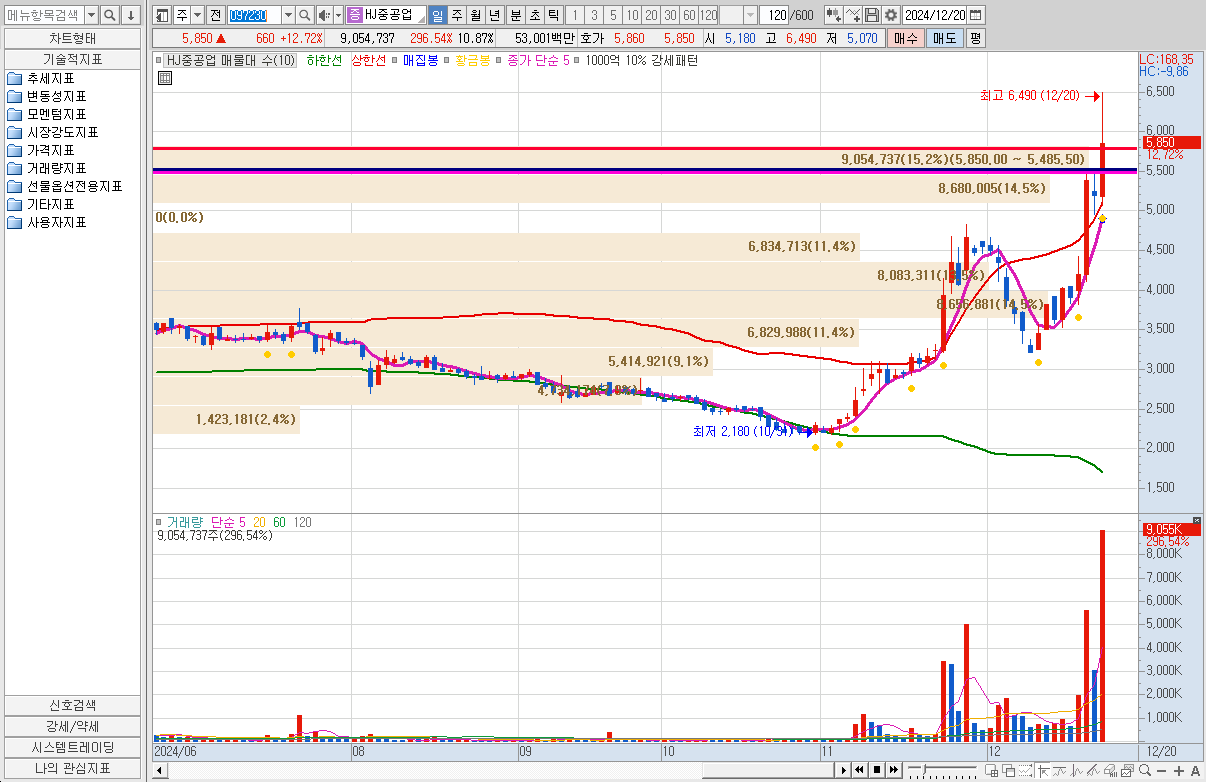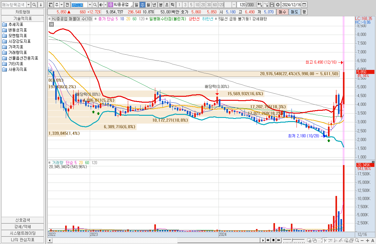 HJ중공업(097230)은 이달 초 방위사업청이 발주한 해군의 대형수송함(LPH-I)과 고속상륙정(LSF-II) 외주 창정비 사업 입찰에 참여해 적격심사 등 관련 절차를 거쳐 최종 사업자로 선정됐다고 18일 밝혔다. 두 건의 수주 금액을 합산하면 677억 원이다.방위사업청과 2,663.30억원 규모 검독수리 Batch-II 후속함(9~12번함)수주 계약 체결에 급등하였다. ▷방위사업청(대한민국 해군)와 2,663.30억원(최근 매출액대비 12.32%) 규모 공급계약(검독수리 Batch-II 후속함(9~12번함)) 체결(계약기간:2024-12-19~2028-10-31) 공시하였다. 그러면서 12월 18일에 상한가를 갔다. 그러면서 20일 다시 공시가 나면서 12% 상승하였다. 현재 매물대에 걸려 있지만 저 매물대를 소화하다면 우상향은 할 수 있을 것으로 본다. 물론 그럴려면 이슈가 한가지 더 있어야 할 것이다. 실적면에서 개선이 되어 우상향은 할 수 있을 것으로 기대된다. 그러므로 만약에 23일주에 기회를 준다면 익절을 하면 될 것 같다.