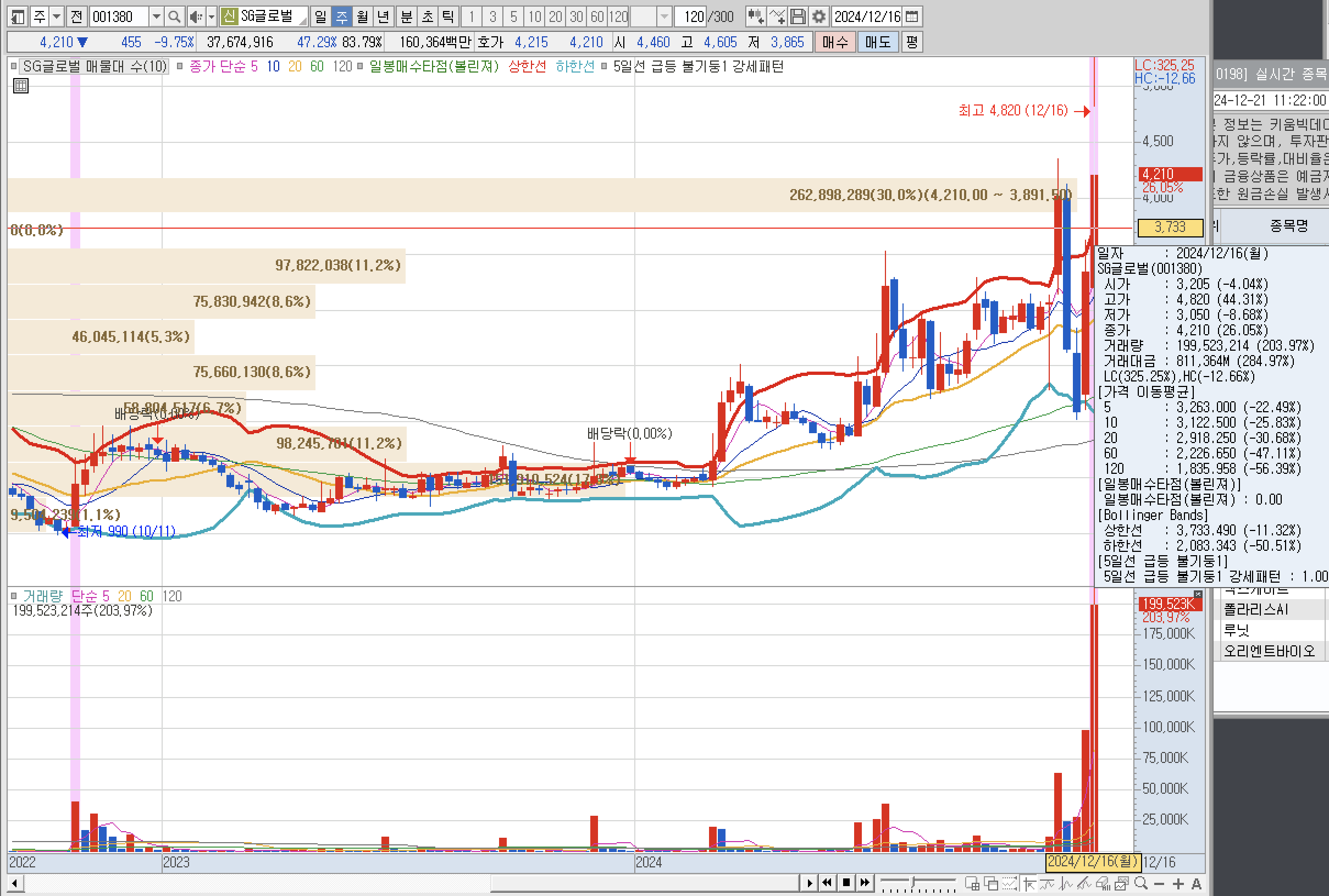 김동연관련주로서 탄핵정국 속 조기 대선 기대감이 지속되면서 이번주는 이재명주에서 김동연주가 상승을 크게 했다. 월요일 시초가에 매수했다면 3,205원에 매수를 하여 고가 4,820원까지 상승하면서 44%라는 어마어마한 상승을 보여주었다.