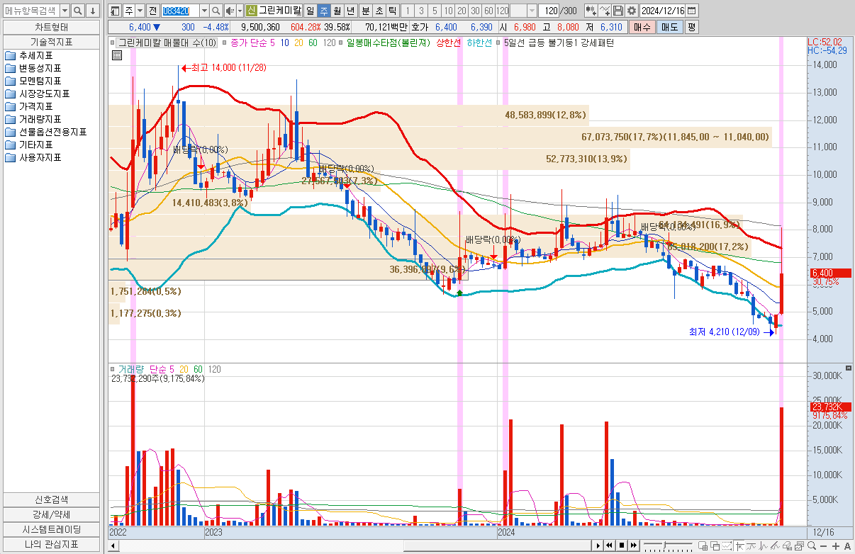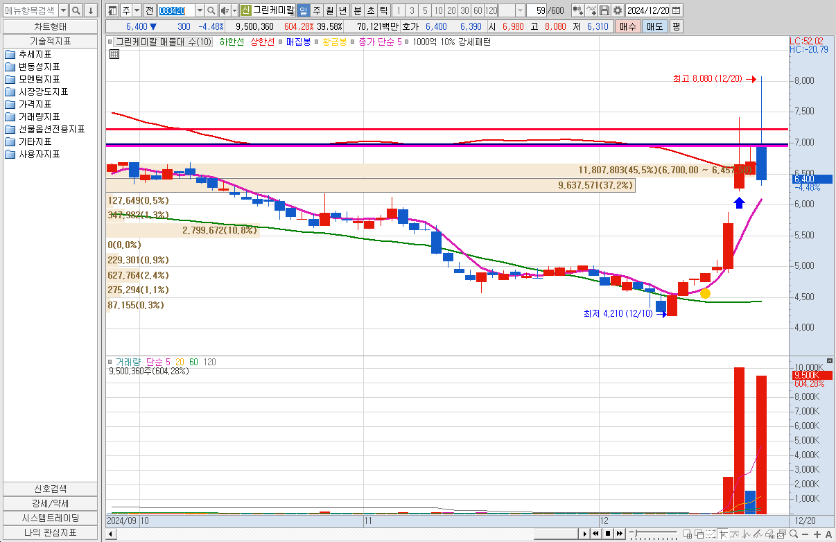 12월 20일 탄소 포집, 활용, 저장 관련주들이 강세가 이어졌다. 도널드 트럼프 미국 대통령 당선인과 그의 측근인 일론 머스크테슬라 최고경영자(CEO)가 탄소 포집·활용·저장(CCUS) 분야에 대한 투자를 지속할 것으로 알려지며 기대감이 반영된 결과로 풀이된다. 향후 트럼프가 CCUS 관련 세액공제를 폐지할 가능성은 낮다는 분석이 나온다. 엑손모빌과 옥시덴탈 페트롤리움은 석유 생산을 증대하기위해 탄소를 유전에 주입하는 CCS 방식을 이미 적극 활용하고 있다. 또한 이들 기업은 CCUS의 신기술 개발에도 상당한 투자를 하고 있는 상황이다. 에코바이오는 바이오가스를 기반으로 신재생에너지와 바이오황 관련사업을 추진하고 있다. 특히 신재생에너지 기반 유지 관리목적으로 수도권매립지에서 포집시설을 운영하고 있다. 그린케미칼은 이차전지의 전해액 등으로 사용되는 디메칠카보네이트(DMC)를주요 제품군으로 하고 있으며, CCU 기술을 확보하고 있는 것으로 알려졌다. 수급은 전체적으로 들어온 상황이다. 트럼프 관련주에 속하게 때문에 지속적으로 상승을 할 수 있을거라 생각한다. 차주에도 상승을 할 수 있을거라 생각한다. 쉽게 하락을 하지 않을듯하다. 현재 6,400원인데 8,000원은 다시 갈 수 있을 것으로 예상된다. 주봉으로 매물대는 10,300원대에 있기 때문에 충분히 거기까지는 갈 듯하고 다음 저항은 11,200원이다. 저 저항대가 강하기 때문에 저항을 맞고 떨어지면 다시 매집하면 좋을 듯하다. 주봉차트이기때문에 시간이 걸릴 수 있다. 그러니 꾸준히 관찰하고 매수해보자. 우선은 두 종목다 월요일 시초가로 매수를 하고 향후 방향성을 지켜보도록 하자.