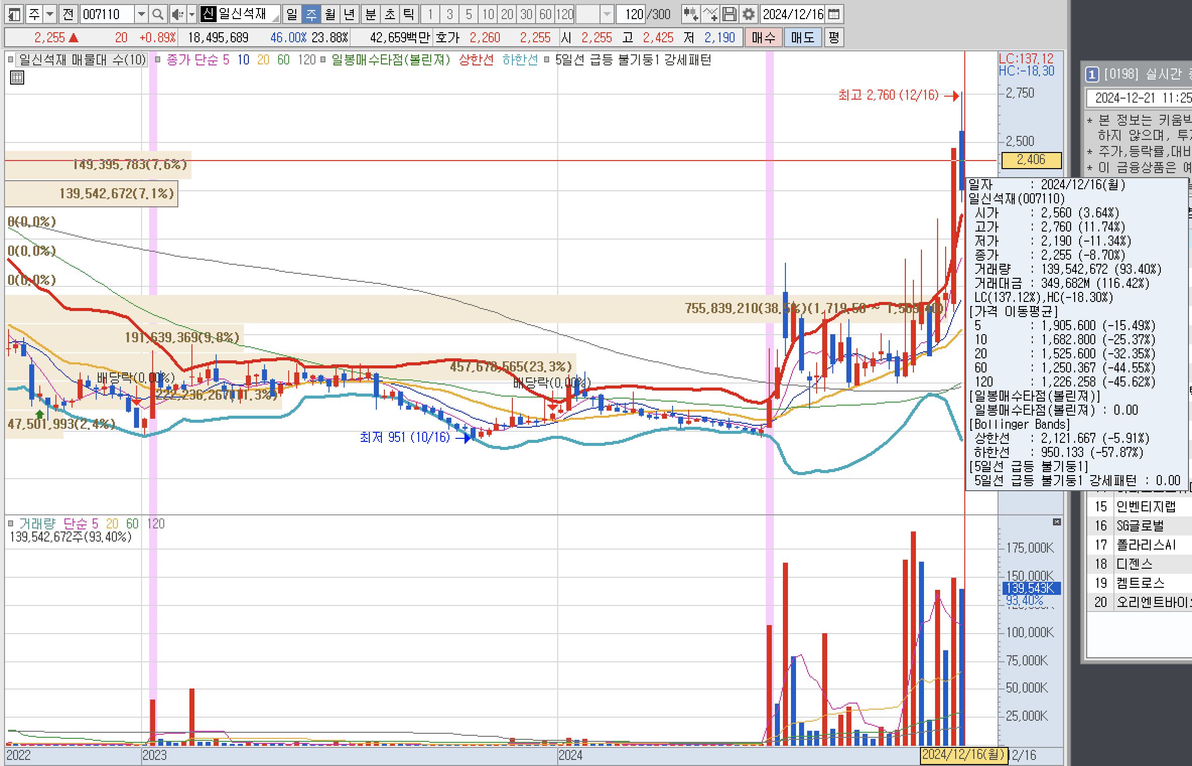 일신석재의 경우는 남북경협주로서 시가 2,560원에 매수를 했으면, 고가 2,760원 11.74%라는 수익을 얻을 수 있었다.