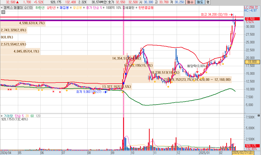 젬백스: 이 주식은 계속해서 대량보유자가 매수를 하고 있다. 그렇다면 역시 상승의 여력은 충분하다고 볼 수 있다. 허지만 너무나 많이 단기간에 올랐기 때문에 조심할 필요는 있다고 본다. 나는 이런 종목은 매수를 하지 않는다.