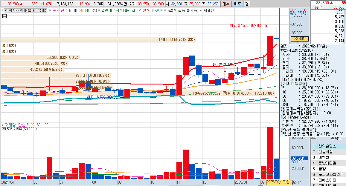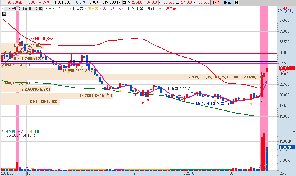 포스코DX: 포스코DX (+35.27%) 2차 전지 트럼프 관세 면제 가능성 및 LG에너지솔루션·도요타 계약 소식에 반등, 내가 좋아하는 패턴 중에 하나인 종목이다. 이유는 상한가를 갔고 윗꼬리를 달면서 우상향을 하고 있다. 수급은 충분히 들어왔고 올라갈 준비는 되어있다. 먼저, 30,000원까진 올라갈 수 있고, 41,000원까진 올라갈 수 있다 충분히 41,000원까진 차주에 기대해 볼 수 있다.