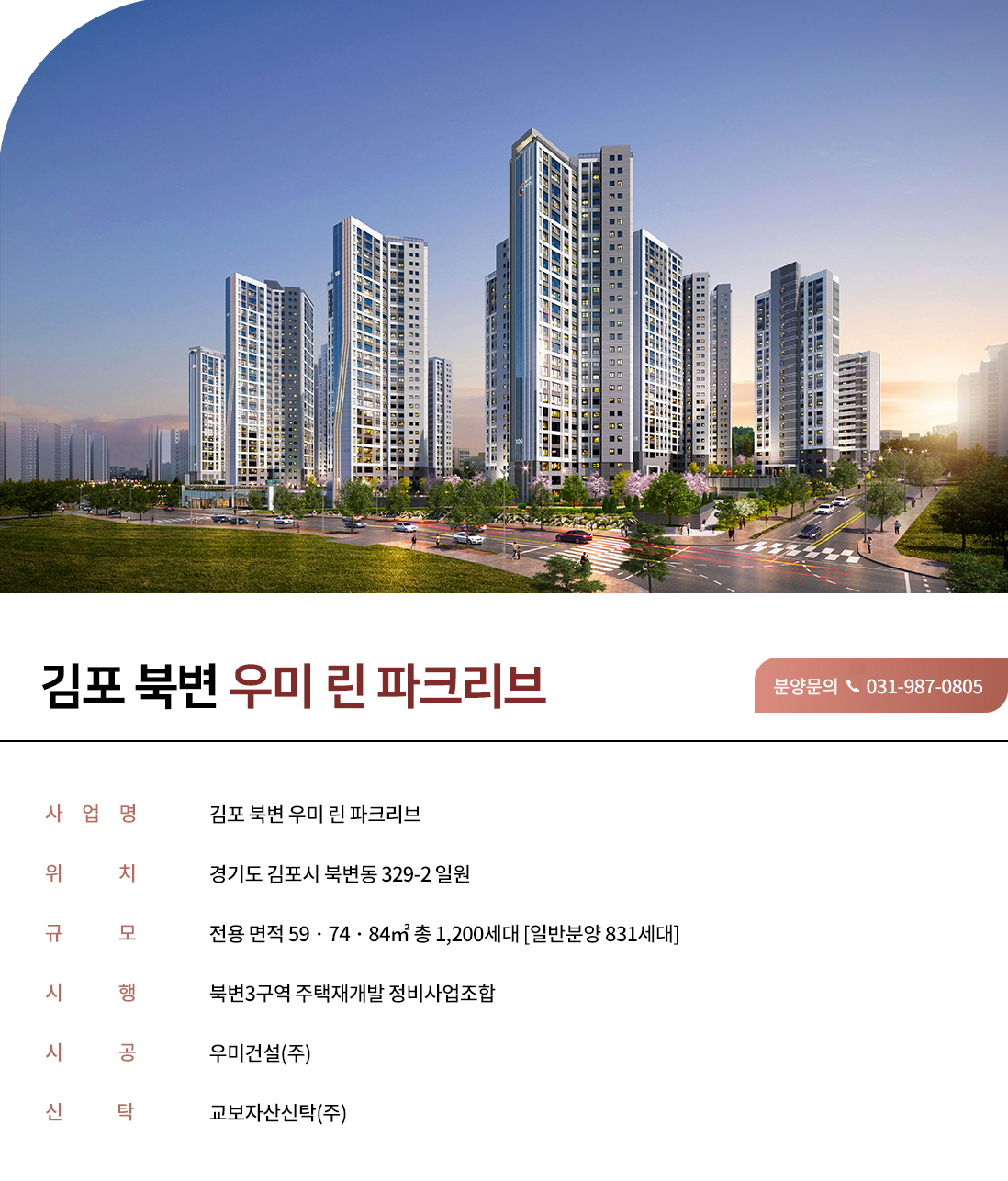 김포 북변 우미린 파크리브 북변동 329-2 일대에 위치하며 북변3구역 주택재개발 정비사업조합으로 시행된다.