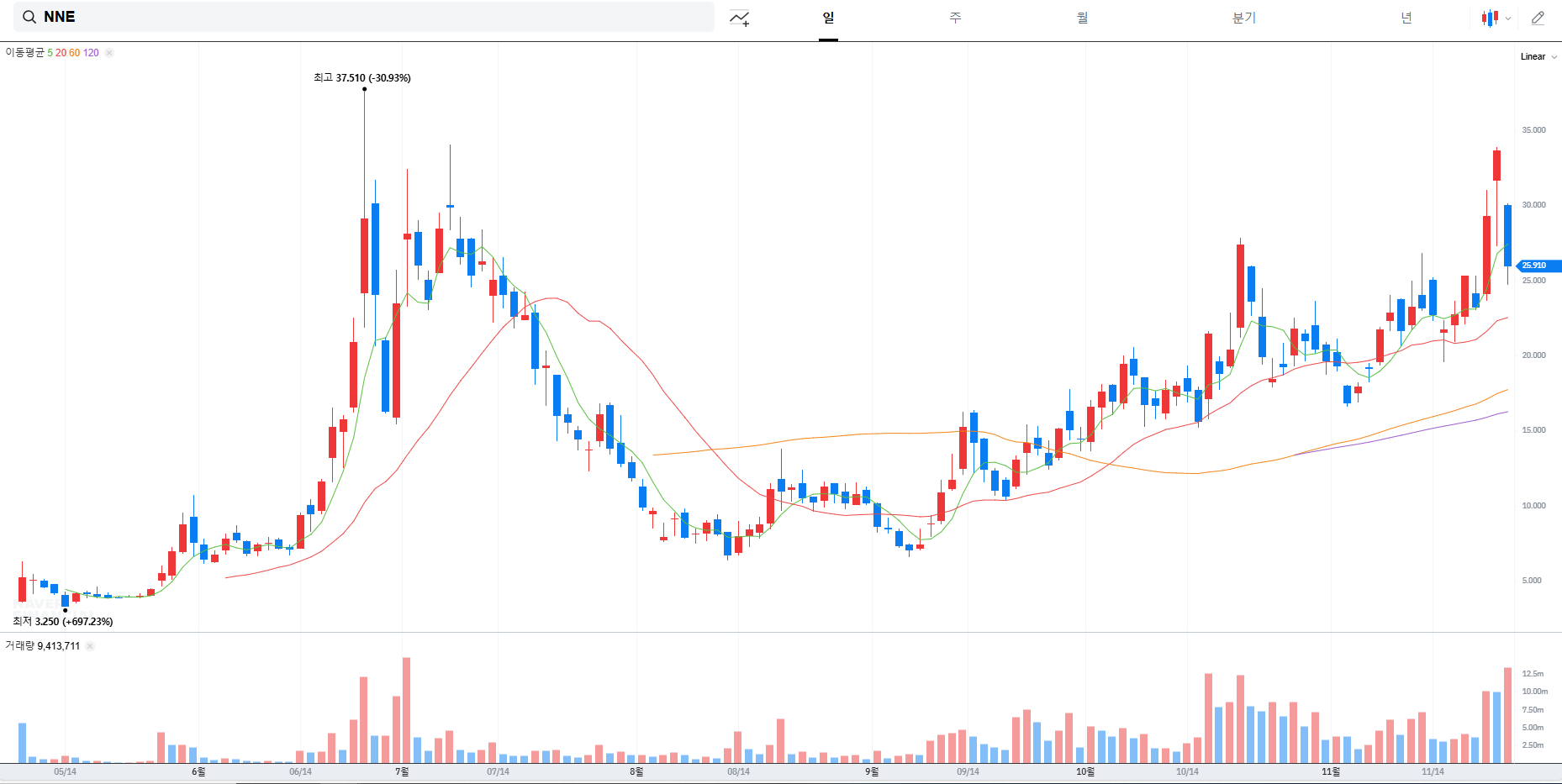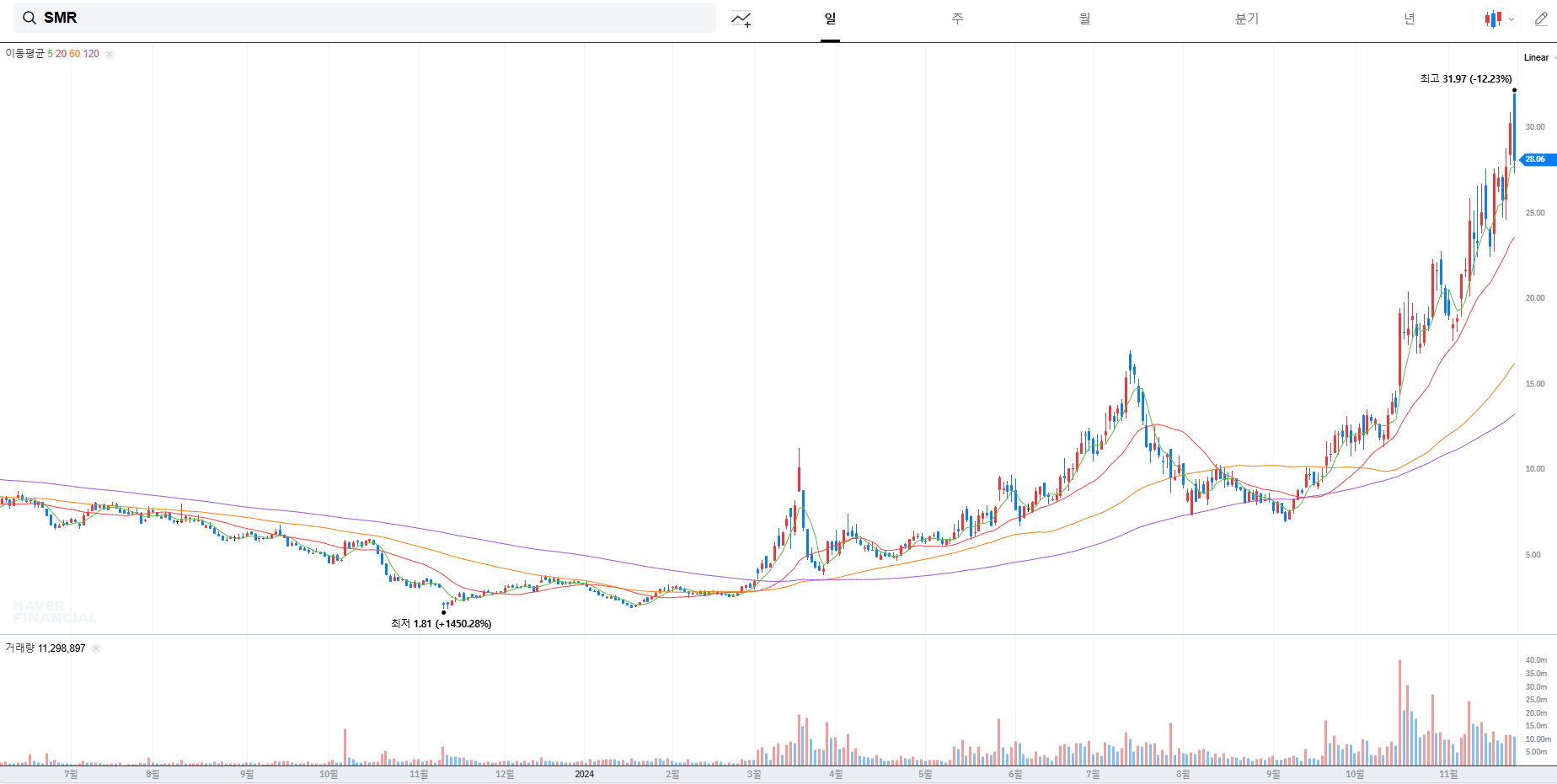 AI를 사용하기 위해서는 데이터 센터가 필요하고 데이터센터를가 필요하니 여기에 전력, 전력 설비를 설치해야하니 최근에 소형 모듈러 원전을 구축하고 사용하겠다라고 하여 소형 모듈 원전 테마주가 크게 상승을 하고 있다. 나노 뉴클리어 에너지를 보면 게속해서 상승을 하다 11월 25일 -22.89하락 마감했다. 계속해서 상승을 했기 때문에 차익 매물이 나온 것일 수 있다. 지금 한달내 두배 이상 주가 탄력 흐름이 나왔다고 할 수 있다.