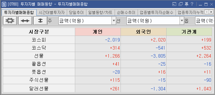 현재 투자자별 매매동향이다. 코스피는 개인만 매도하고 있으며, 기관과 외국인은 매수세이다. 코스닥은 외국인이 주로 매도 개인과 기관은 매수중이다.