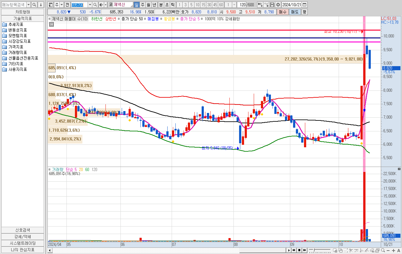 10월 16일 상한가를 가고 17일에 25%상승을 하므로서 장대 양봉을 만들어 놓았다. 그전까지 수급이 없다가 올린것으로 수급이 들어왔다라고 판단되어진다. 독자저인 원천기술이 hyFc융합 단백질 및 DNA백신 제조기술을 바탕으로 바이오 신약을 개발하는 업체이다. 주요 신약 개발 제품 라인으로는 함암면역치료제와 지속형 항체융합단백질 치료제 제품군, 유전자 치료백신 제품군으로 분류된다.
