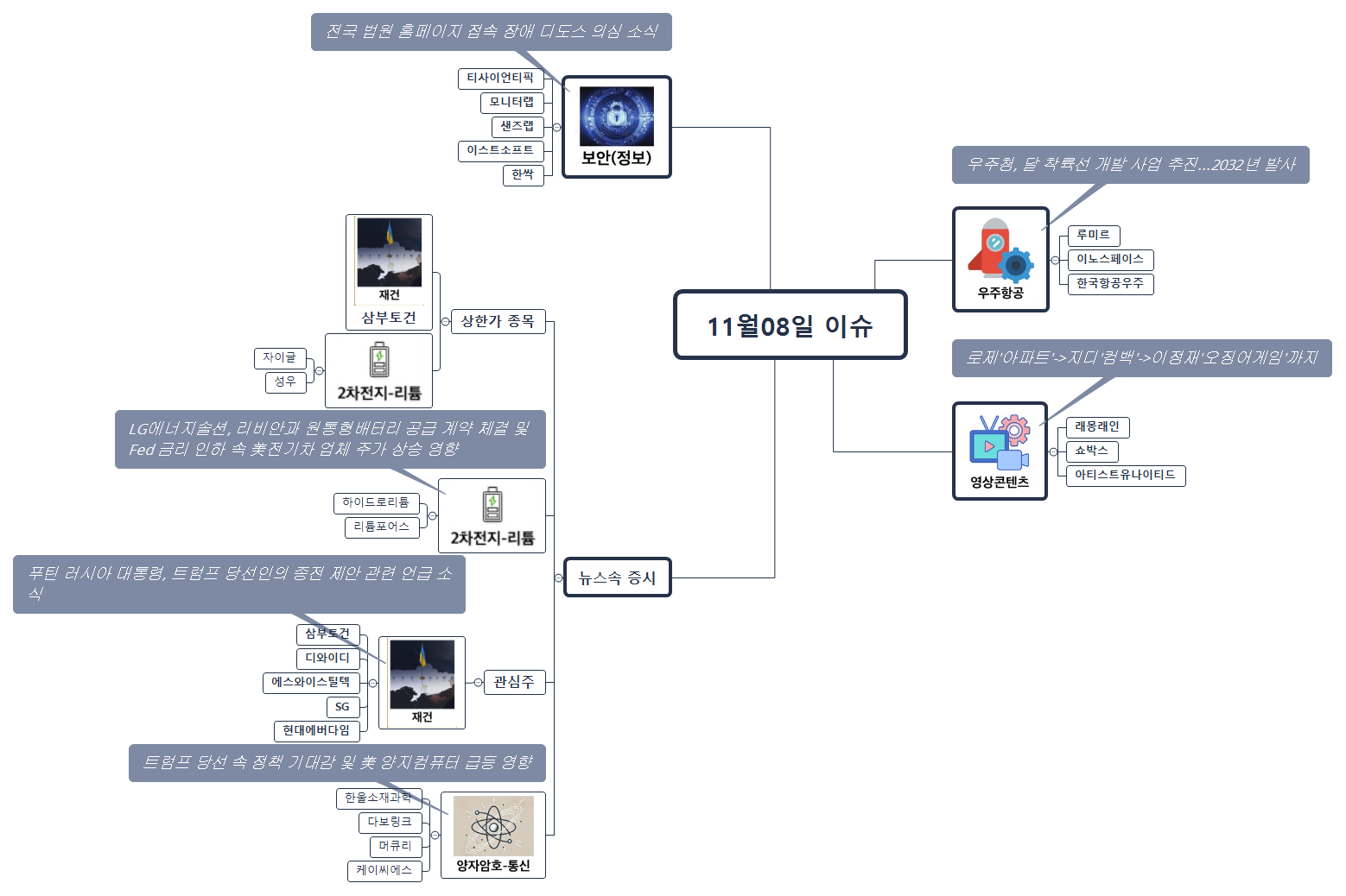 다음주에도 트럼프 관련주 중에 재건, 조선업 기자재, 우주항공 관련주들을 관심이 지속될 것으로 보인다.