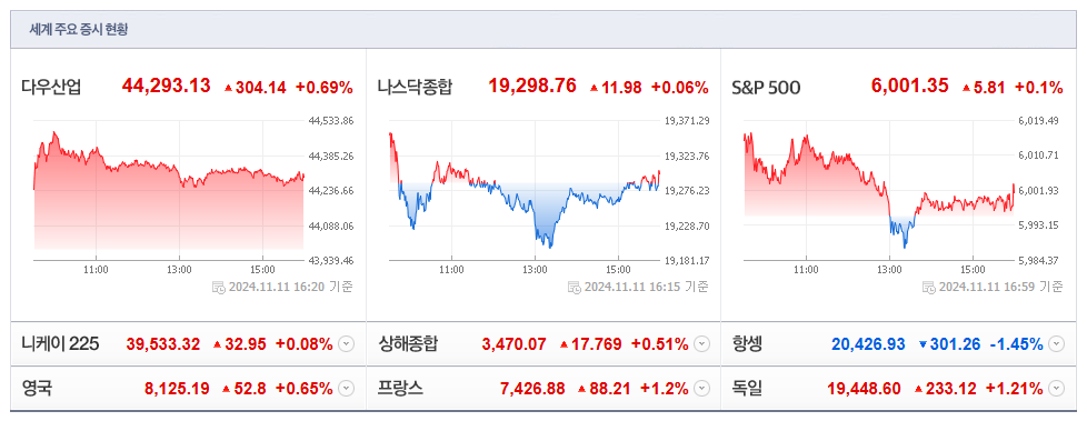 뉴욕증시 3대지수 상승 마감. 트럼프 트레이딩 지속되며 경기소비재/금융/산업재 강세 - WTI, 공화당의 상/하원 동시 집권(레드스윕) 가능성 상승에 따른 달러 강세 지속에 하락 마감. NDF 원/달러 환율 1,400.0원 호가 - 미 국채 시장 '베테랑의 날(Veterans Day)'을 맞이하여 휴장된다.