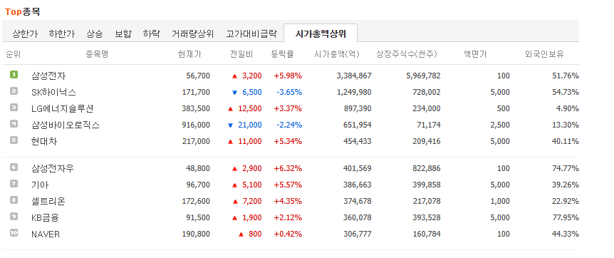 시가총액 상위 종목 1~10까지 중에 2가지 빼고 모두 상승으로 마무리하였다.그러다 보니 코스피를 끌어 올리는 역할을 하였다.