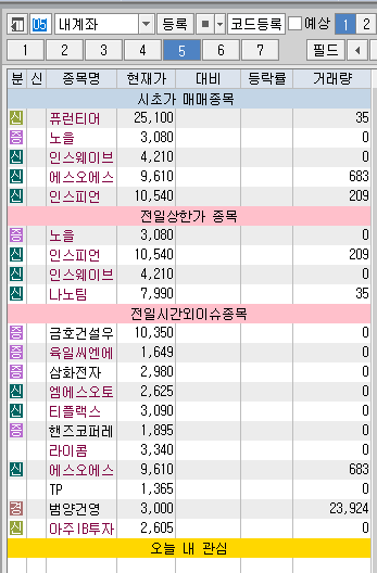 금일 증시에 대해서 예상해보자. 시간외에서 일제히 상승한 희토류 관련주가 장 초반에 움직이다가 최근 계속 순환매가 들어온 AI, 조선, 자율주행, 암호화폐, 재건, 로봇, 대북주 등에서 주요한 이슈가 생길 수 있다. 그런데 이렇게 뻔하게 가진 않을 수도 있겠단 생각이 들었다. 최근 다소 잠잠해지면서 조정받고 있는 조선주, 혹은 악재 노출 이후 센티가 회복되고 있는 방산주 등에서 반등이 나오지 않을까하는 생각이 든다. 오늘 관종에서는 조선주, 방산주를 추가 해놓으면 좋을 듯하다. 조선주는 일승, 전쟁은 스페코가 시세를 잘 주는 듯하다. 또한 테슬라 완전 자율주행 최신 버전 공개 임박을 하면서 자율주행 관련주로 라이콤, 에스오에스랩, 퓨런티어가 있는데 여기의 대장은 퓨런티어다. 하지만 차트로는 에스오에스랩이 좋다고 할 수 있다. 나는 에스오에스랩을 추가해보자. 다음으로 머스크 스페이스X 이동통신 사업 승인으로 통신장비 관련주로 솔리드, 옵티코어, 우리로, 우리넷이 있는데, 무엇이 수급으로 움직이는 지켜봐야 할 것이다.