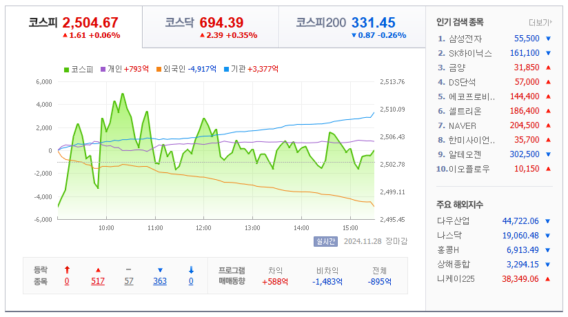 한국 증시는 다양한 요인에 의해 영향을 받았다고 할 수 있다. 주요 주식 지수인 KOSPI는 0.3% 상승하였으며, KOSDAQ도 0.5% 상승하였다. 이러한 상승은 주로 해외 시장의 긍정적인 신호와 국내 경제 지표의 개선이 주요 요인으로 작용했다고 볼 수 잇다. 11월 28일에는 특히 주식 시장에서 긍정적인 흐름이 나타났다고 볼 수 있다. 이는 주요 기업들의 실적 발표와 관련된 긍정적인 기대감이 주요 요인으로 작용했다. 또한, 국제적으로는 미국 경제 지표의 긍정적인 결과와 관련된 긍정적인 영향이 있었다. 증시의 변동성은 다양한 요인에 의해 결정되며, 이는 경제 지표, 정치적 이벤트, 금융 정책 등이 포함된다. 예를 들어, 한국은행의 금리 결정이나 정부의 경제 정책 발표는 증시에 큰 영향을 미칠 수 있다. 한국 증시는 또한 기업 실적과 관련된 정보에도 민감하기 때문이다. 주요 기업들의 실적 발표는 증시에 큰 영향을 미칠 수 있으며, 이는 투자자들의 신뢰도와 관련이 있다.