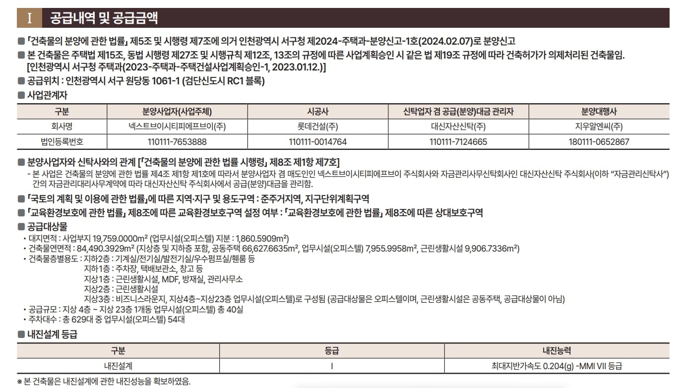 인천 서구의 연평균 인구수는 6%, 세대수는 7% 증가했으며 세대 규모는 축소되고 23년 1월 이후 거래량은 증가하는 추세이다. 금융 위기 이후 15년 청라와 루원시티로 집중 공급이 이루어진 이후 19년부터 검단에 공급이 시작되며 22년부터 순차적인 입주가 진행되고 있다. 검단 넥스티엘 분양가는 기입주 단지들 중 59형 물량들의 실거래&공급가는 14,126~14,719천 원에 이르는 수준이다. 또 서구 오피스텔은 대부분 청라에 공급이 집중됐으며 당하동, 원당동인 당 PJT 권역에는 공급량이 부족한데다 대부분 1~2룸 수준이라 전용 20~30평대 상품들이 희소하다. 이에 따라 중대형 위주로 아파트 대체 상품이라 인식되는 검단 넥스티엘 롯데캐슬이 확실한 경쟁력을 갖추고 있으니, 미래가치와 희소성까지 함께 갖추었다 총평할 수 있겠다.