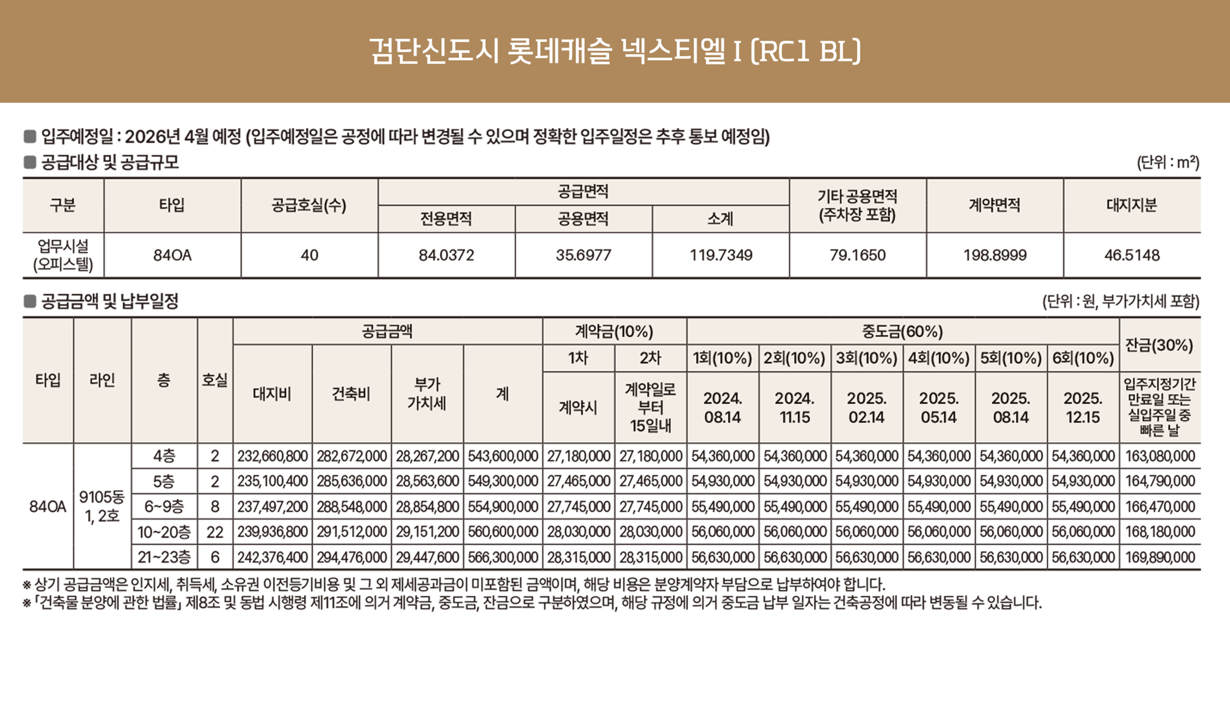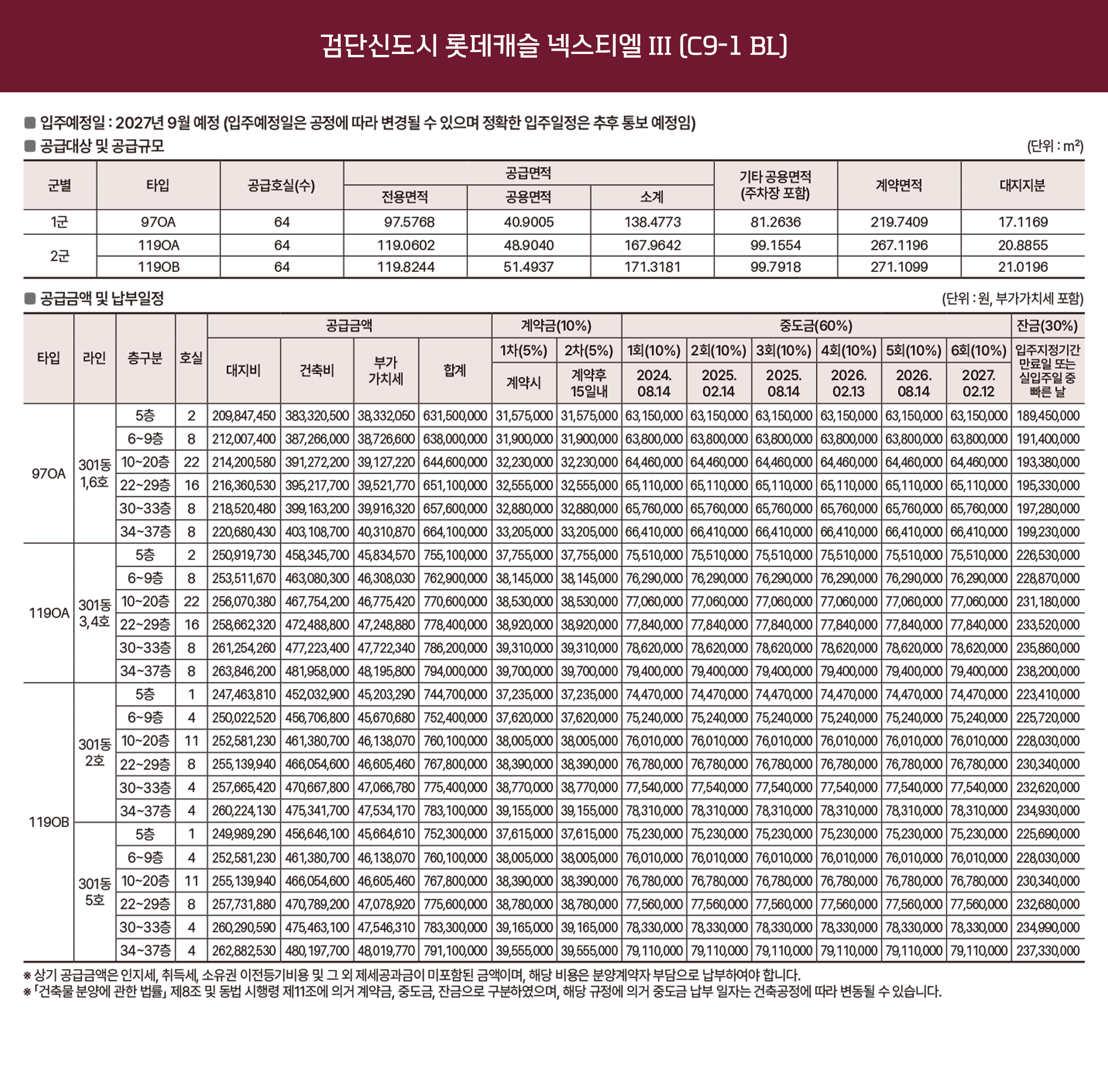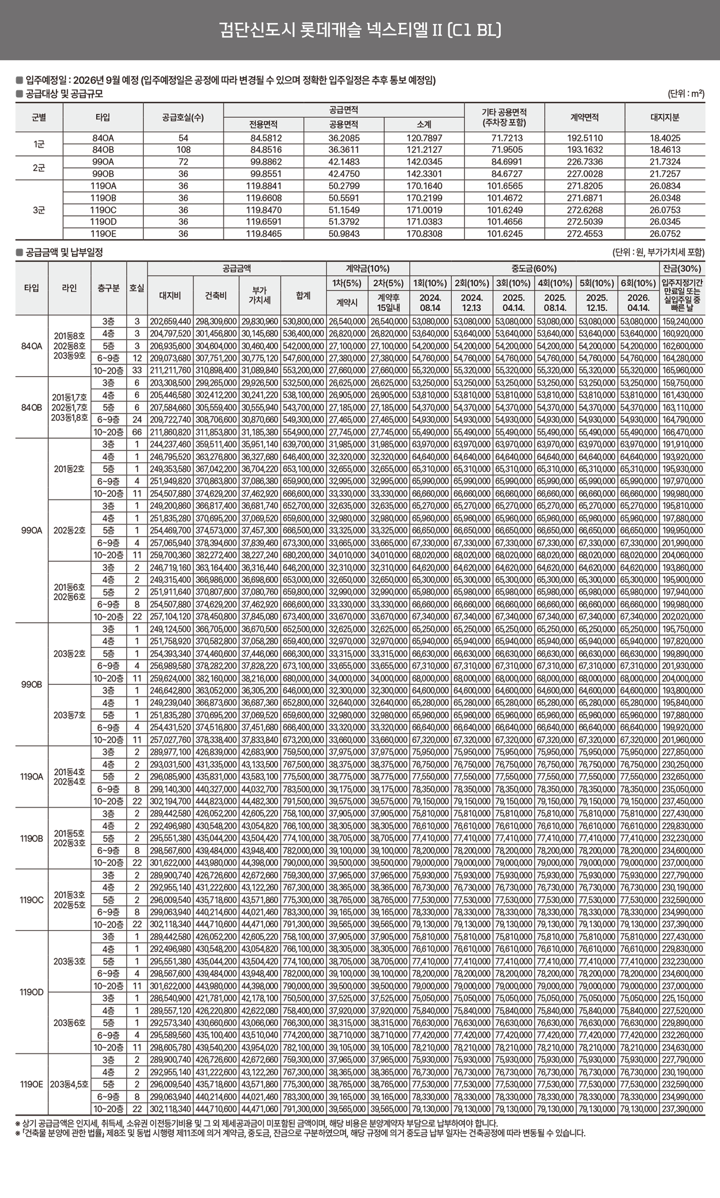 본 단지는 검단신도시 RC1, C1, C9-1BL에 각각 40, 450, 192실씩 마련될 예정이며 건축 규모는 지하 7~2층부터 지상 23~37층으로 다양하다. 공급타입도 상이한데 84m2로 단일하게, Ⅲ는 97과 119m2의 대형평형으로, Ⅱ는 84, 99, 119 세 가지 면적으로 다채롭게 공급되며 주차는 세대 당 1.35~1.67대씩 수용 가능해 여유로운 편이다.