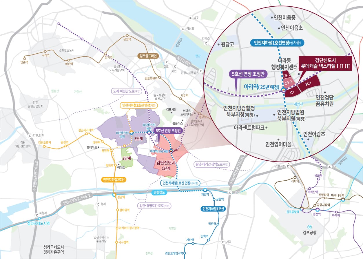 검단 넥스티엘 롯데캐슬 바로 옆으로는 인천 1호선 연장 신설역인 101역이 2025년 개통을 앞두고 있으며 해당 노선은 출퇴근시 4분, 일반시 8분 간격으로 운행될 예정이다. 해당 역에서 2정거장 가면 나오는 103역에서는 역시 연장사업이 진행되고 있는 2호선 신설역에 도착해 환승 가능하며, 1정거장 이동하면 공항철도로 경유할 수 있는 계양역에 닿는다. 계양역에서 공항철도로 1정거장만 이동하면 5호선, 9호선, 김포골드라인, 서해선으로 모두 환승 가능하며 소요 시간으로 설명하면 김포공항까지 6분, 마곡나루까지 10분, 디지털미디어시티까지 17분, 홍대입구까지 21분, 공덕까지 24분, 서울역까지 28분 소요된다. 서부권광역급행철도(GTX-D)가 예타조사 대상으로 선정되며 더더욱 탄탄한 교통망을 만들어주는데, 부천종합운동장역에서는 GTX-B 노선까지 공유 가능해 완공시 검단에서 용산역까지 약 20분대에 도착할 수 있게된다. 2030~2031년에는 서울 5호선도 연장되어 검단, 장기, 누산역 등을 거칠 것으로 좀 더 빠른 서울권 진입이 가능하게된다.