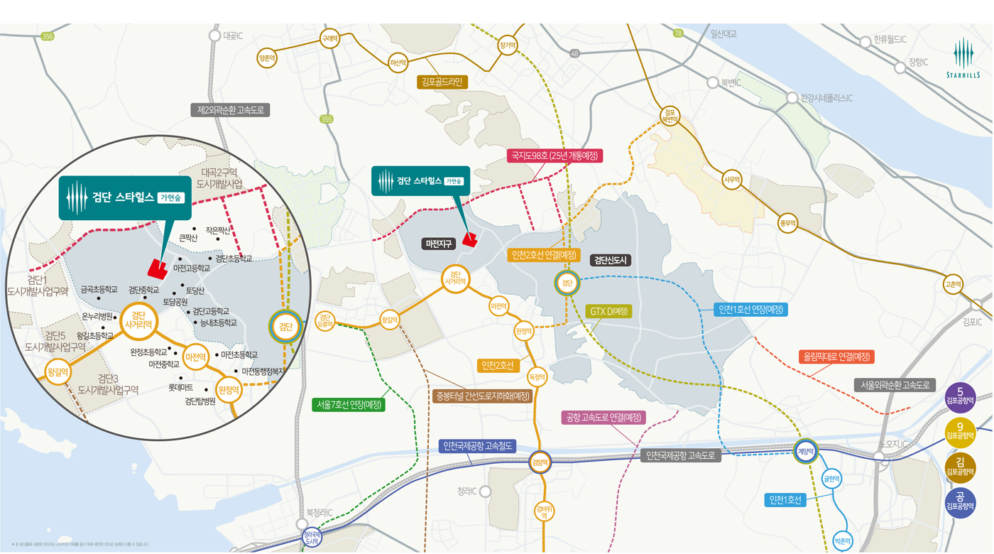 역세권이라는 점은 이렇듯 단순히 역까지 조금만 걸어도 되어 좋고 자차 없이 이동 가능하여 선호도가 높다. 인천 지하철2호선 역세권으로 서울의 대표 업무지구와도 잘 연결되는 환경이다. 본 현장의 경우 향후 GTX-D노선이 들어오면 김포시 및 부천시와 더 가까워진다. 특히 강남권의 접근성은 더 높아진다고 하니 참고하기 바란다. 검단 스타힐스 가현숲의 교통망은 현재 검단신도시 내의 아파트보다 우수하지 않을까 싶다. 이미 지하철역이 위치하고 도심 접근성이 우수하기 때문이다.