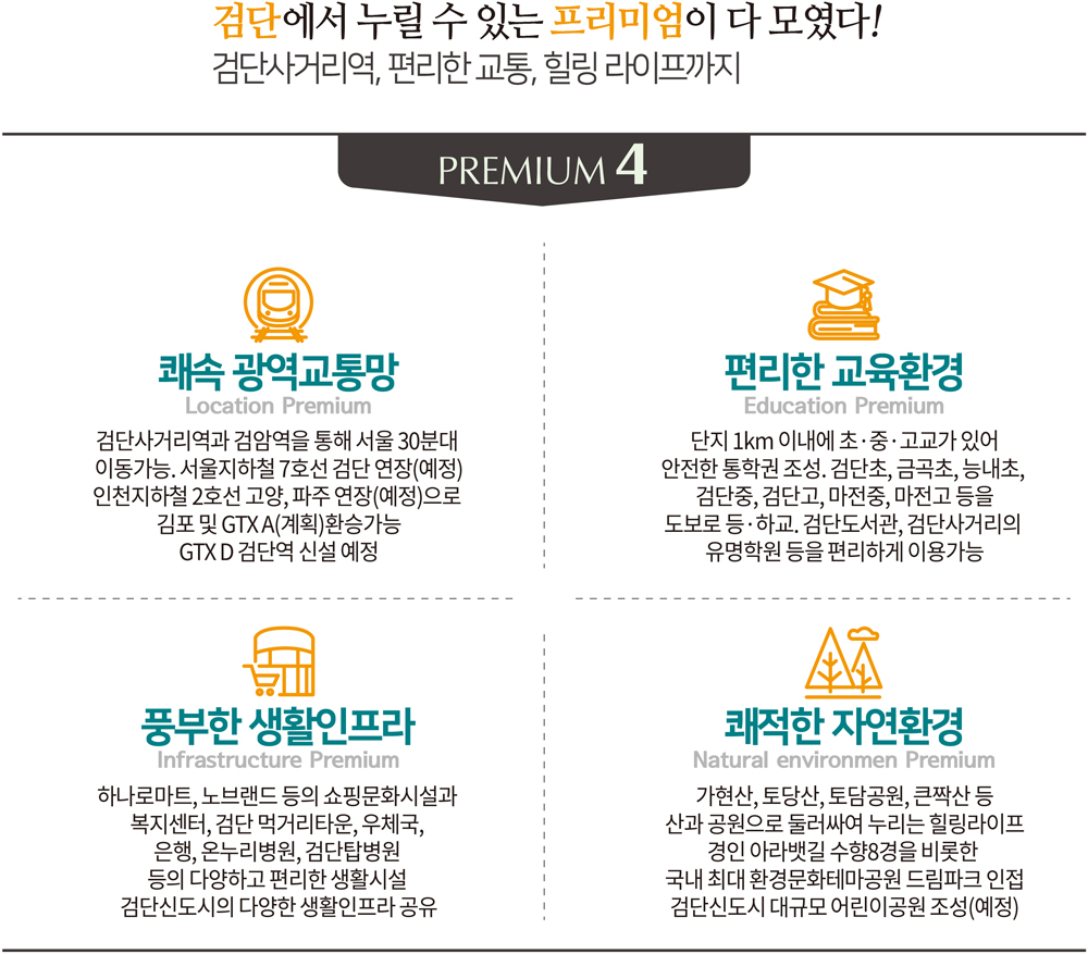 이곳은 자연 친화적인 여건을 자랑한다. 옆으로 숲이 위치하여 상당히 녹지가 풍부한 편인데, 사업지와 가까운 거리에 가현산이 위치하기 때문이다. 미세먼지로 인한 불편함이 높아지면서 더욱 대두되는 것이 쾌적성이다. 주거지는 편리한 인프라만 갖추면 된다는 예전 생각과 달리 이제는 건강한 새활이 가능한 환경이 대세가 되었다. 검단 스타힐스 가현숲은 그런 점에서 한 번이라도 더 산에 오를 수 있으니 건강한 라이프가 실현된다.
