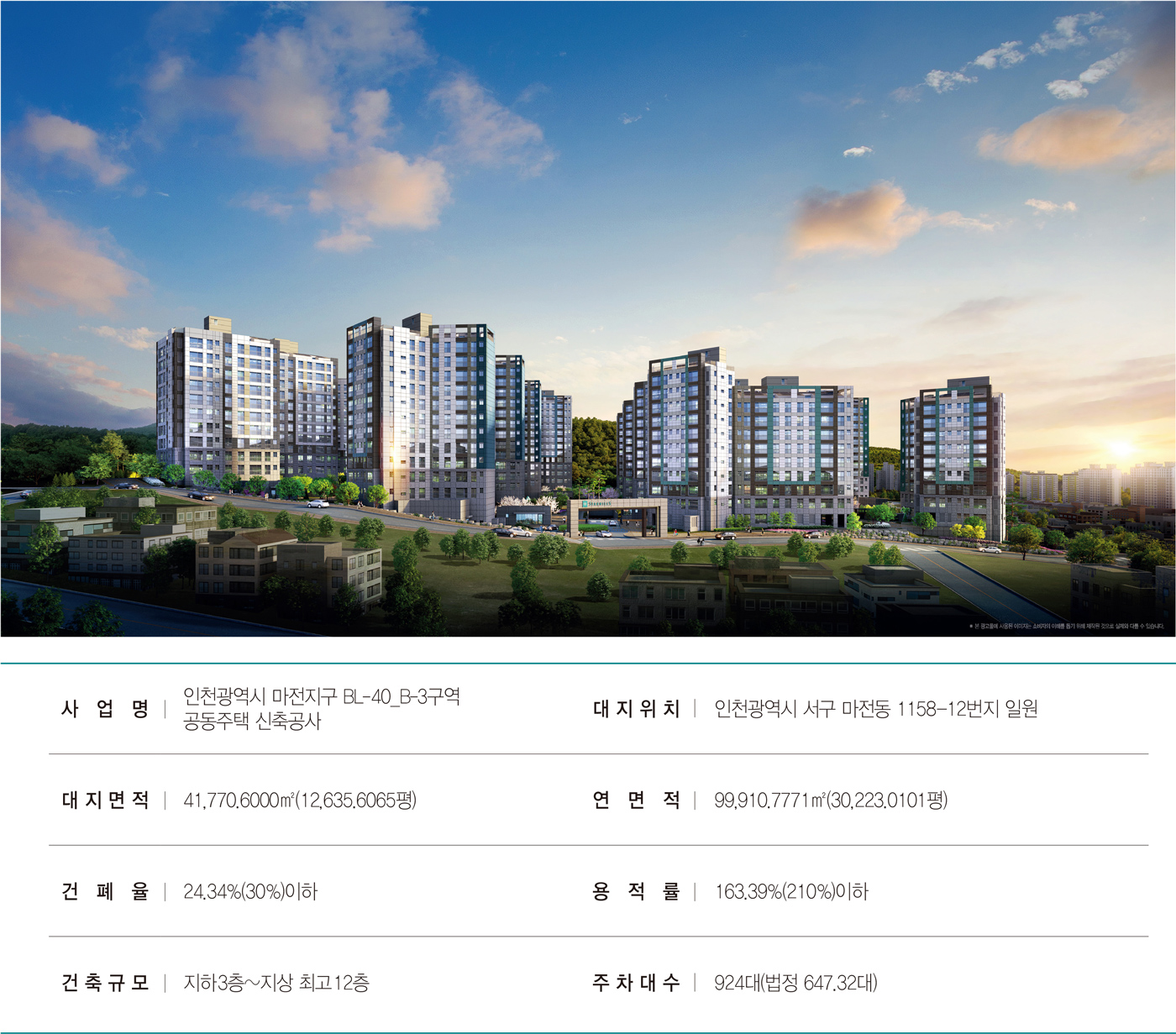 인천 서구 마전동 일원의 제3종일반주거지역에 들어서는 곳으로, 지구단위계획에 따라 신축되는 아파트이다. 대지면적 약 1, 2만 평에 용적률 163.39%가 적용되어 지상 12층 높이로 건축된다. 전체 15개 동에 709세대가 입주할 예정으로, 평형대를 체크해 보면 전용면적 59m2, 75m2, 84m2 를 10개 타입으로 구성하고 있어, 가족 구성과 라이프 스타일에 맞게 선택이 가능하다. 다만, 현재 153세대가 일반 분양으로 나온 상태라 빨리 선점이 필요성이 있다.