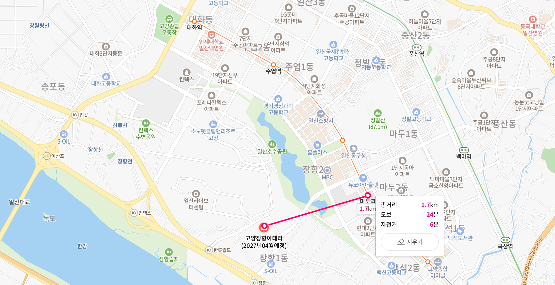 GTX-A 노선이 예정되어 있는 킨텍스역까지 도보로 가기에는 다소 무리가 있고, 대중교통을 이용해야 한다. 가장 가까운 지하철역은 마두역인데 이곳도 도보로는 무리가 있을 것 같다. 요즘 전동킥보드, 전기자전거들이 많이 있는데 이런걸 이용하면 편리하게 지하철을 이용할 수 있다. 그렇다면 백마역까지도 가능하다. 아마도 장항지구 개발을 하면 유동인구가 증가하기 때문에 대중교통은 생길것이다. 자동차 이용시 장항IC, 한류IC, 자유로 등의 광역도로망과의 접근성은 매우 우수한 편이다. 자동차를 이용하면 자유로, 제2자유로 근접하기 편하기 때문에 이것은 큰 장점이 될 수 있다.