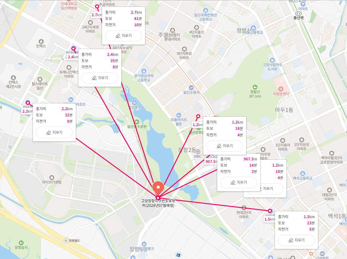 일산호수공원중심: 직선거리 1.1km이지만 단지 앞에 위치하고 있어 이용이 좋다. 이부분이 가장 큰 장점이 될 수 있다. 일산호수공원은 조성도 잘되어 있고 일산사람들이 너무나 많이 이용하고 있는 좋은 자연환경이다. 입지적인 부분에서 부족함이 없다. 일산신도시를 비롯해서 다수의 개발 사업이 진행이 되고 있을 뿐 아니라 장항지구를 포함하고 고양시의 경우 약 105만의 풍부한 배후수요를 기대해 볼 수 있다. 2035년 계획 인구가 약 126만명이라 할 정도로 인구 이동도 많을 것이다.