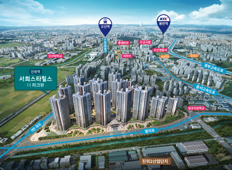 1호선 오산역/진위역 사이 3분~5분거리, 경부고속도로 오산 IC초인접 5분거리, 엘지로 310국도 용인남사 삼성 접근성 탁월 15분 거리. 또한 오산-동탄-수원 트램 광역교통망이 생길 계획에 있습니다. 총 연장 34.2km, 정거장 35개소, 차량기지 1개소로 주요 환승역으로 분당선망포역, 1호선 오산역과 병점역, SRT 동탄역과 연계 계획에 있으며, 진위역 서희스타힐스는 오산역과 진위역 사이 위치하여 오산역-동탄, 수원 망포역간 트램 이용이 가능할 것으로 보입니다. 그러면 생활권은 훨씬 넓어질 것으로 예상됩니다.