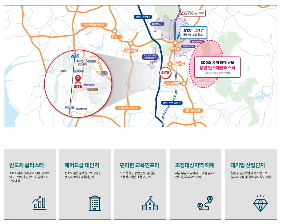용인남사 삼성반도체 클러스트 300조투자 15분 거리, 대규모 산업단지 인접하여 직주근접이 우수, 동탄 10분/평택고덕 삼성 15분/진위남사IC 7~10분정도에 위치하고 있습니다. 삼성반도체가 들어오면서 주거지역과 상업시설이 어마어마한 양이 필요하기 때문에 향후 입지 조건은 좋을 듯 싶습니다.