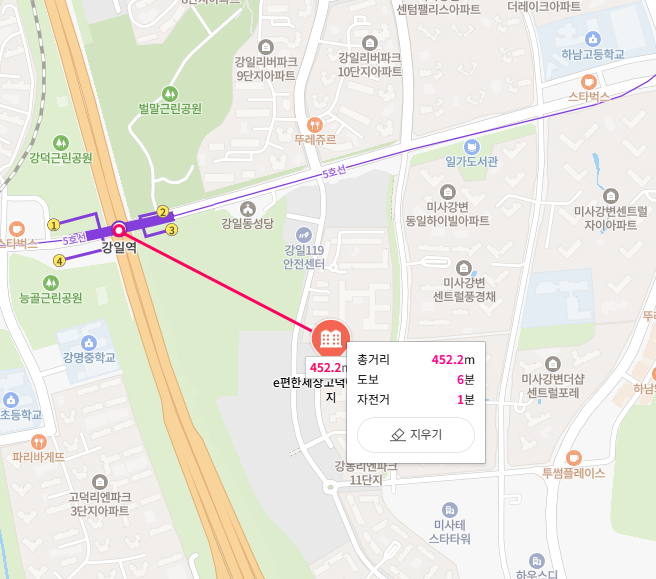 가까운 곳에 강일역이 위치하고 있다. 총거리는 약450m에 있기 때문에 도보로 6분, 자전거는 1분 정도에 있으니 대중교통이용하는데 불편함이 없다.