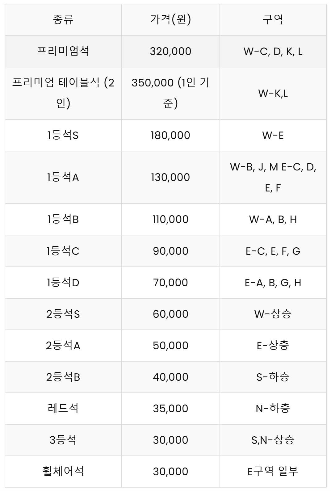 토트넘 뮌헨 축구 경기 가격은 프리미엄석 50만원부터 3등석 3만원까지 구성되어 있다. 자세한 내용은 아래표를 참고하기 바란다.