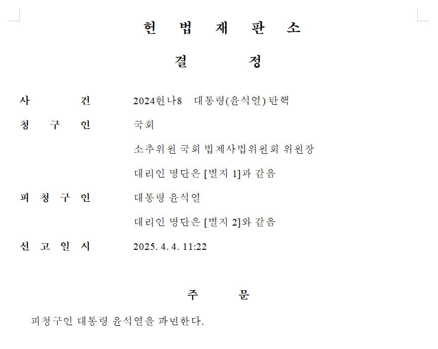 먼저, 대통령 윤석열 파면[헌법재판소 결정문 전문]