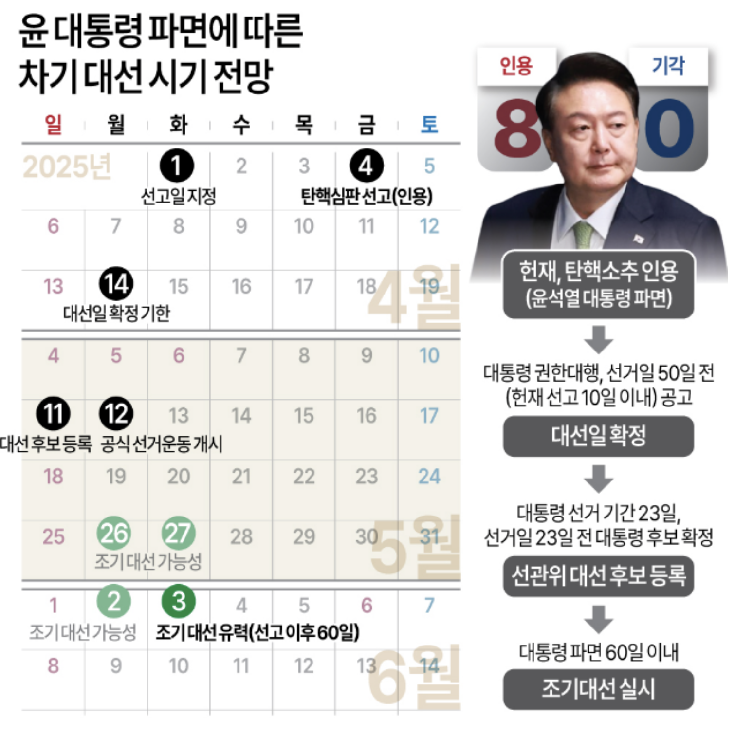 2025년 4월 4일, 헌법재판소는 윤석열 대통령에 대한 탄핵소추안을 인용하여 파면을 결정하였습니다. 이에 따라 헌법과 공직선거법에 의거하여 60일 이내에 새로운 대통령을 선출해야 하며, 선거일은 6월 3일이 유력하게 거론되고 있습니다.