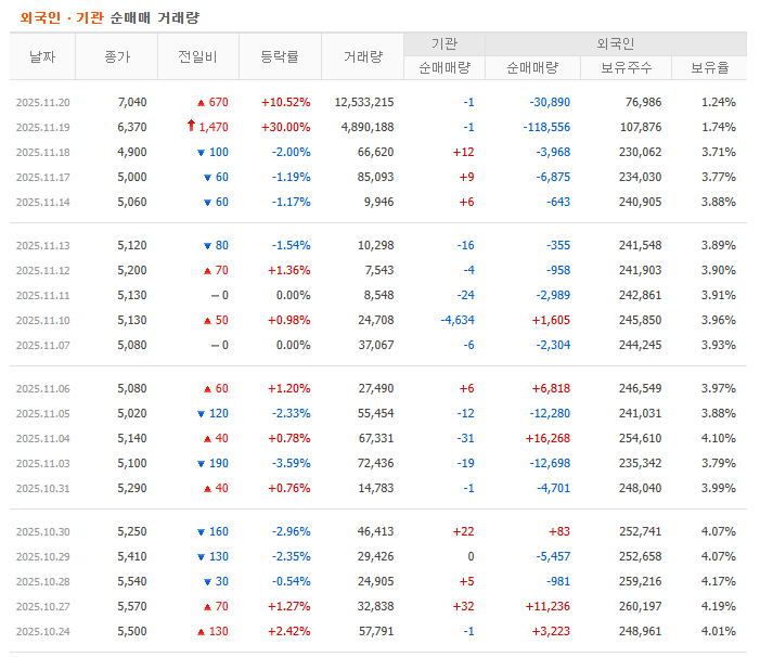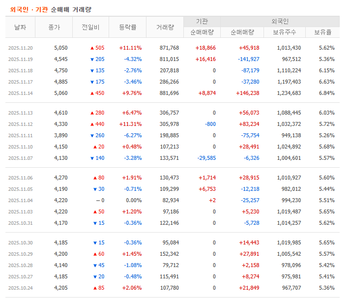 - 기관 보유/거래: 주요 기관 참여는 있으나 외국인 대비 상대적으로 낮은 수준의 외국인 보유율과 중복되는 대주주 구조(특수관계인 지분 등)를 보유.