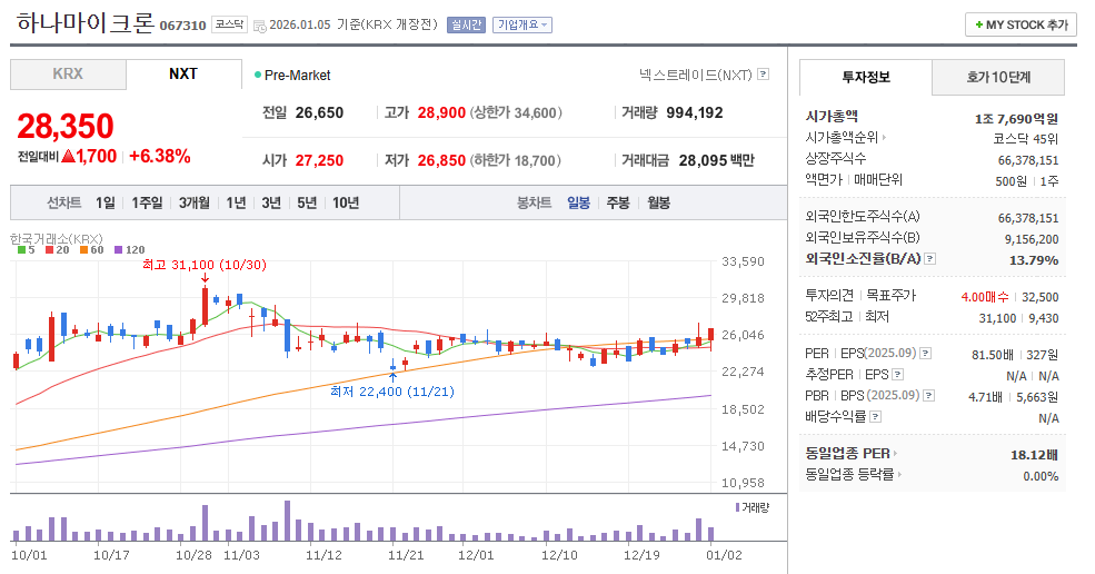 안녕하세요! 오늘은 국내 반도체 후공정(OSAT) 분야의 절대 강자이자, 최근 HBM(고대역폭메모리) 및 2.5D 패키징 기술로 다시 한번 도약하고 있는 하나마이크론의 주가 현황과 향후 전망을 심층 분석해 보겠습니다.