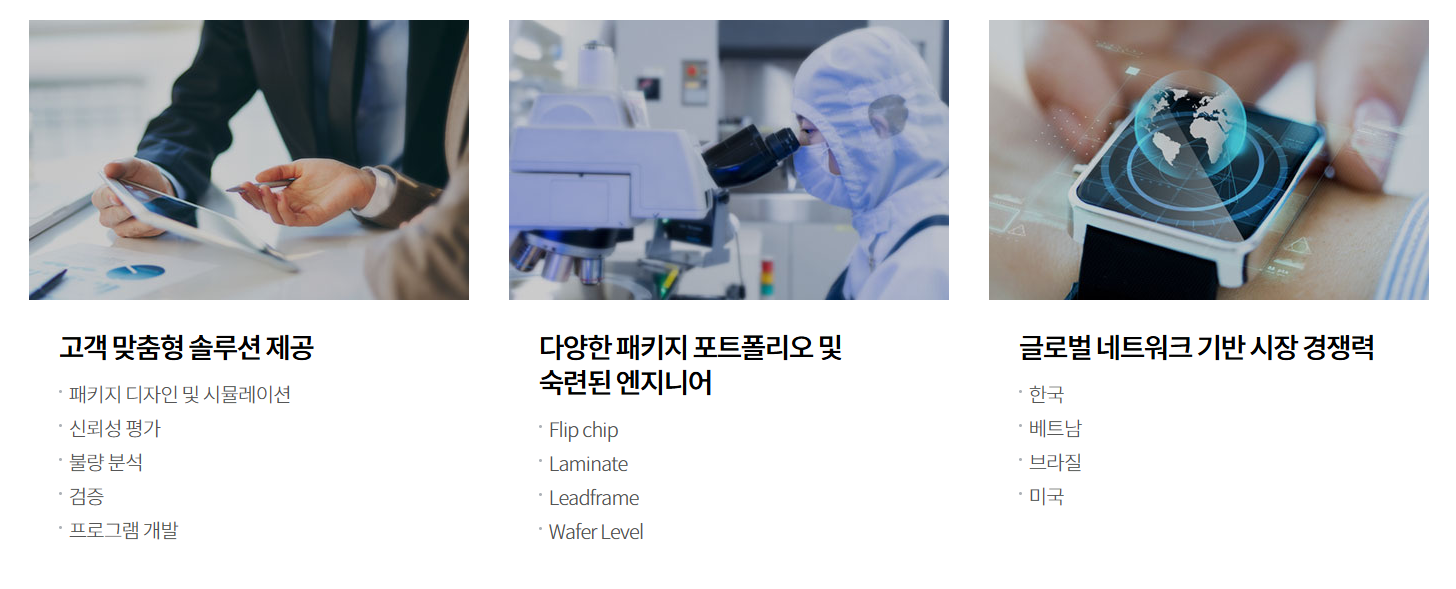 - 주력 제품: 반도체 패키징(MCP, eMMC), 테스트 서비스, 반도체 재료(자회사 하나머티리얼즈).